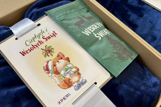 Poza świątecznym motywem zadbaj również o to, aby na prezencie znalazło się subtelne, ale efektowne logo firmy, najlepiej wkomponowane w wzór w taki sposób, aby całość wyglądała jak spójny, atrakcyjny projekt, a nie tylko standardowy nadruk.