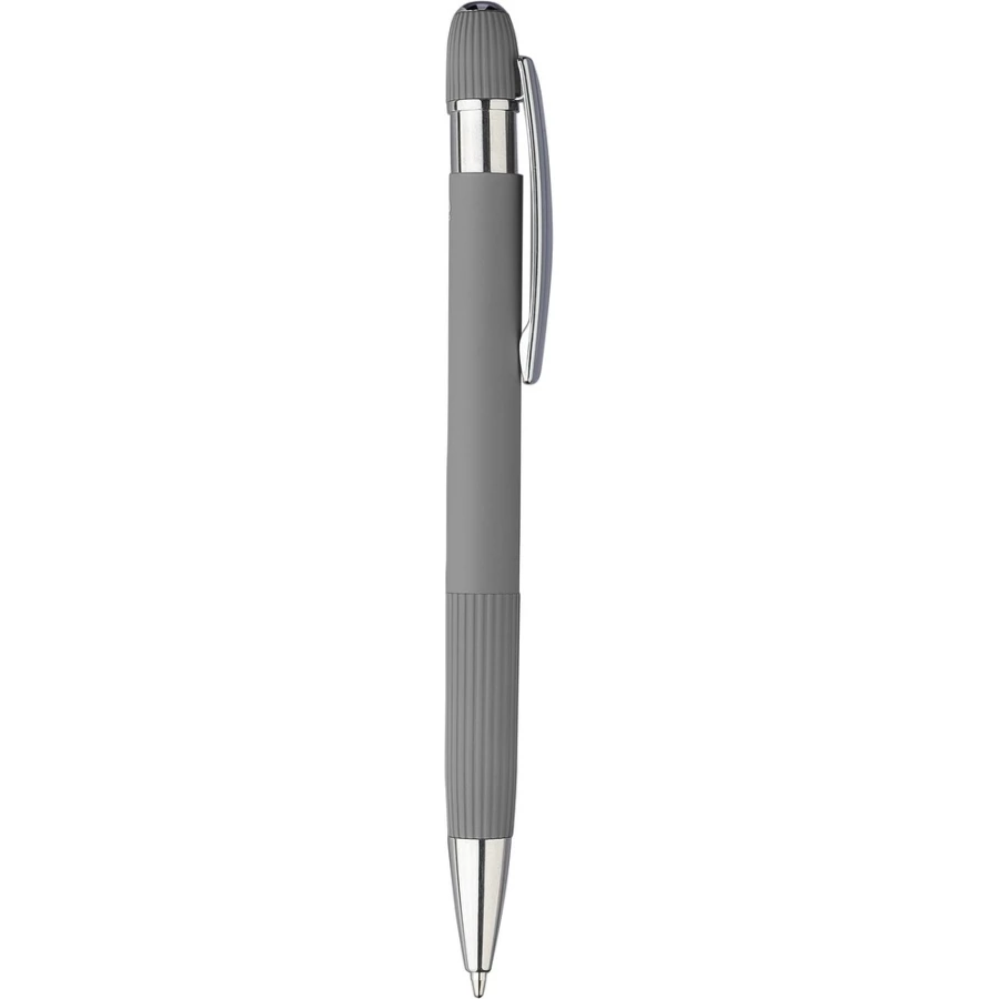 Kugelschreiber aus Aluminium, gummierte Oberflächen, gestreifter Schaft und Oberteil, verchromte Kunststoff‑Spitze, Knopf mit Metallclip, blauer Tintenminen, Recycling‑Symbol.
