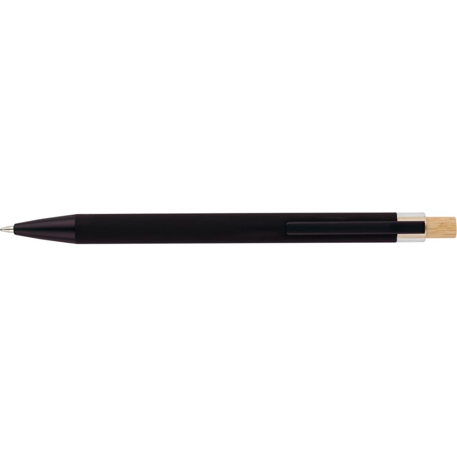 Kugelschreiber, Bambusknopf, Metallclip, Mine in blauer Farbe, Recycling-Symbol auf dem Produkt, reicht für ca. 800 m Schreibstrecke, Produkt aus recyceltem ABS, Aluminium und Bambus