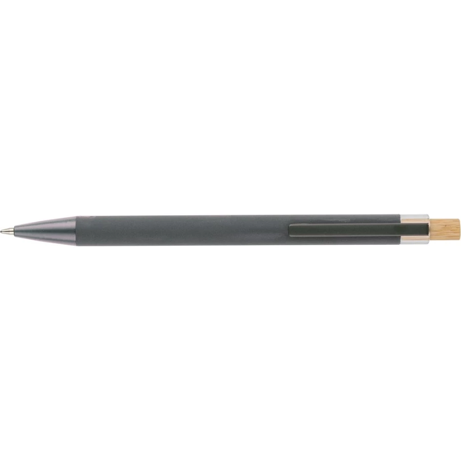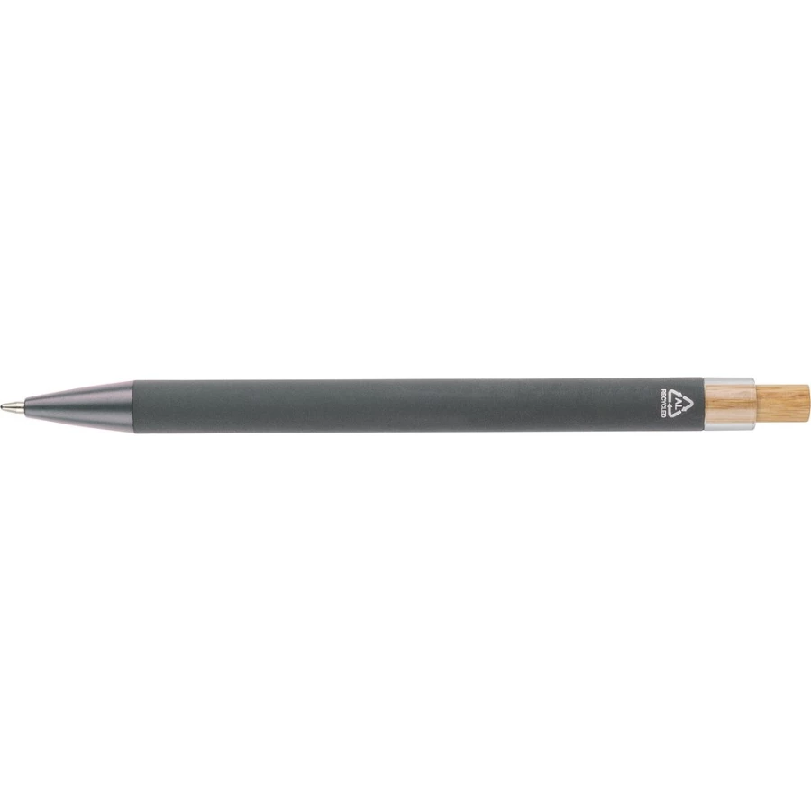 Kugelschreiber, Bambusknopf, Metallclip, Mine in blauer Farbe, Recycling-Symbol auf dem Produkt, reicht für ca. 800 m Schreibstrecke, Produkt aus recyceltem ABS, Aluminium und Bambus