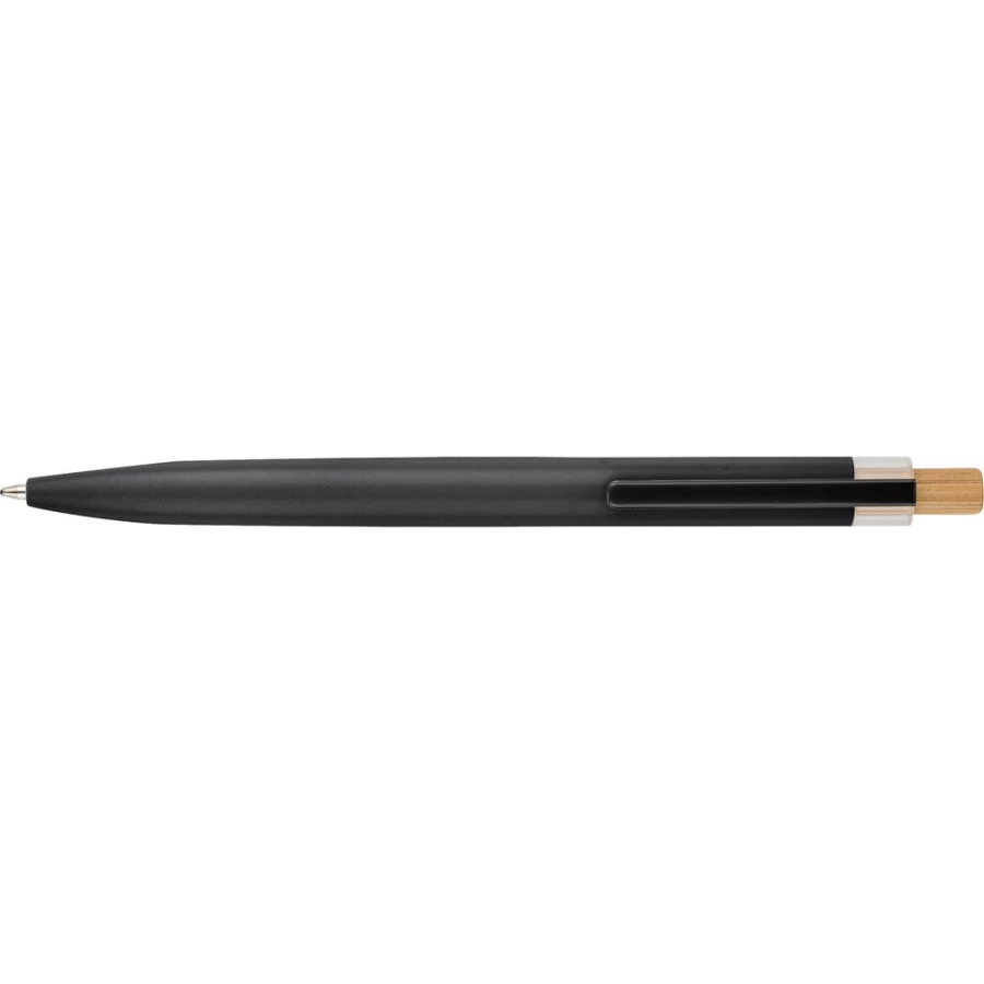 Kugelschreiber, Mine in blauer Farbe, reicht für ca. 700 m Schreibstrecke, Recycling-Symbol auf dem Produkt, Produkt aus Aluminium, RPET und mit Bambusknopf