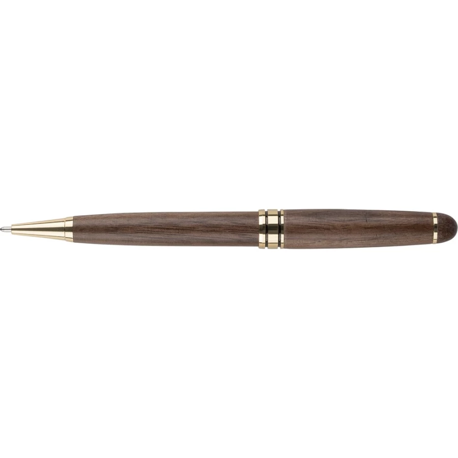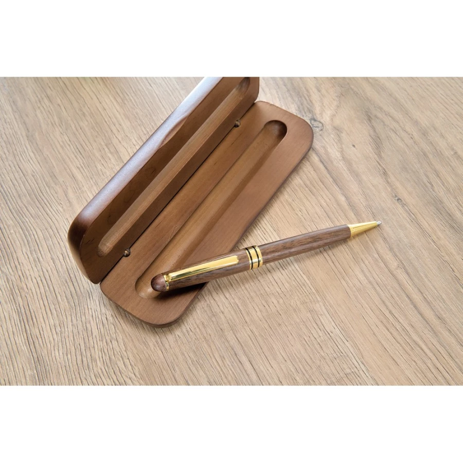 Kugelschreiber , Mine in blauer Farbe, reicht für ca. 1000 m Schreibstrecke, verpackt in einem braunen Karton, Produkt aus Walnussholz