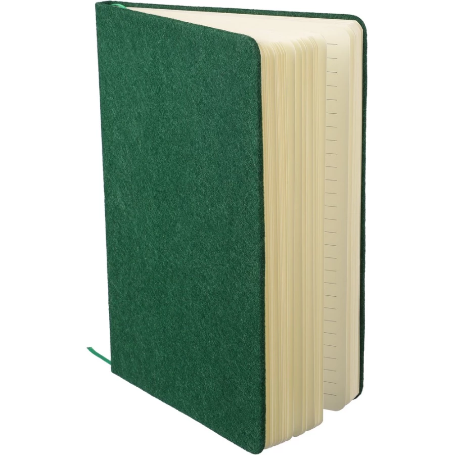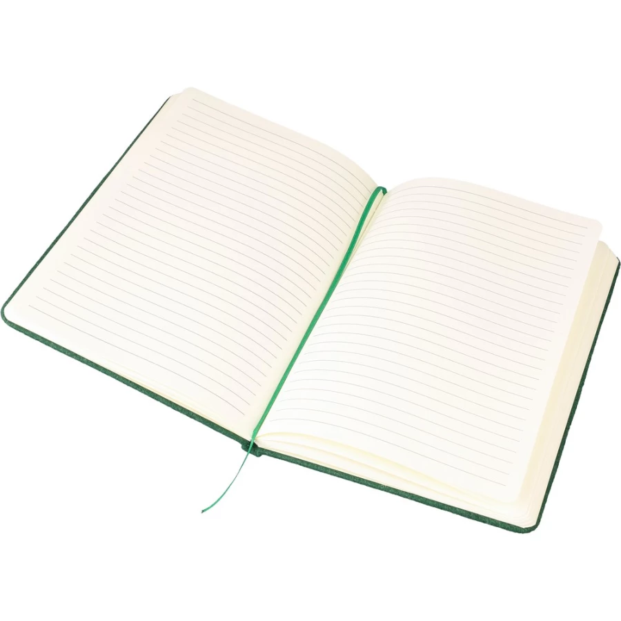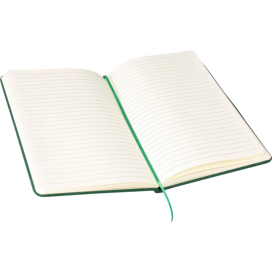Notizbuch ca. A5, 80 linierte Seiten (70 g/m²), äußerer Gummiriemen, Lesezeichen‑Bändchen, Recycling‑Symbol, Material: RPET und PU.