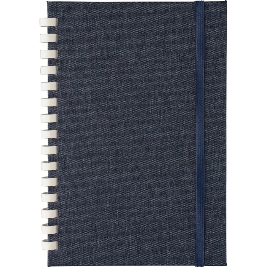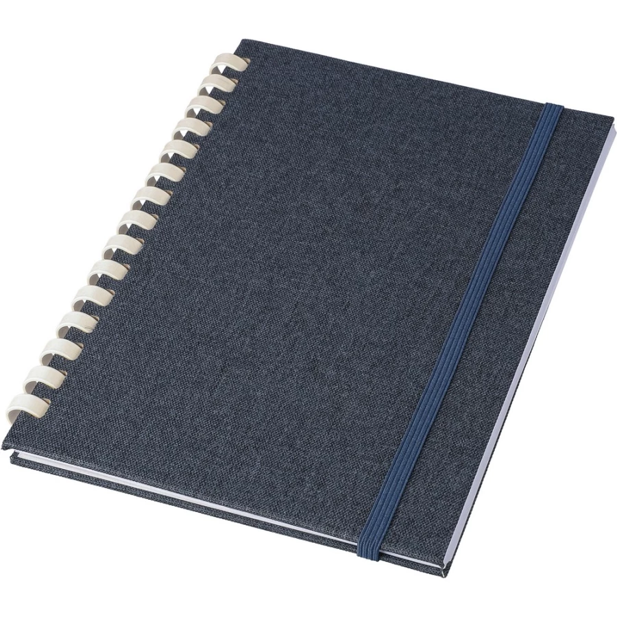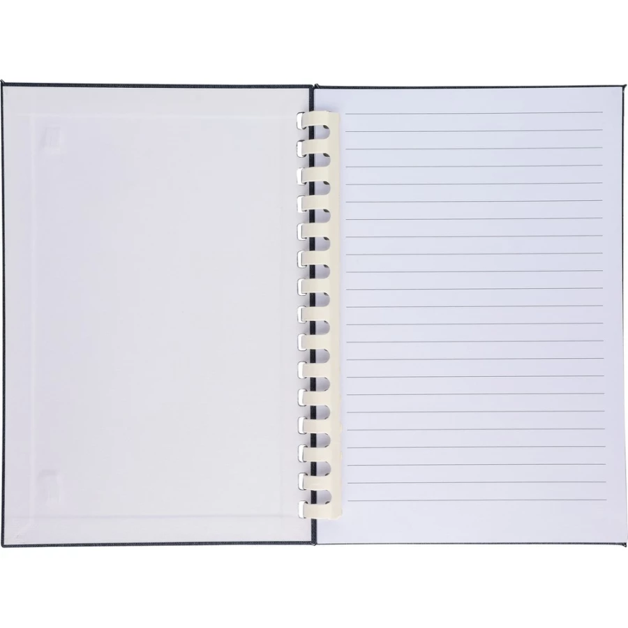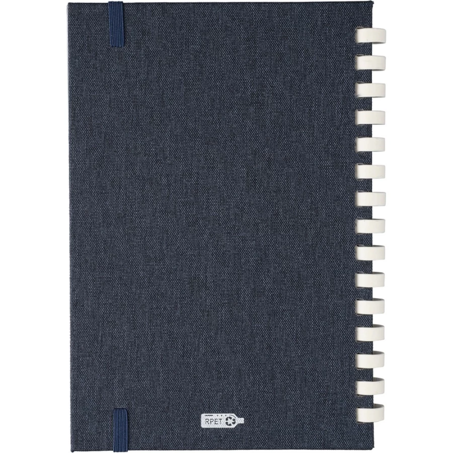 Notizbuch ca. A5, 80 linierte Seiten (70 g/m²), harte Umschlag, äußerer Gummiriemen, Lesezeichen‑Bändchen, RPET‑Symbol, Material: RPET.