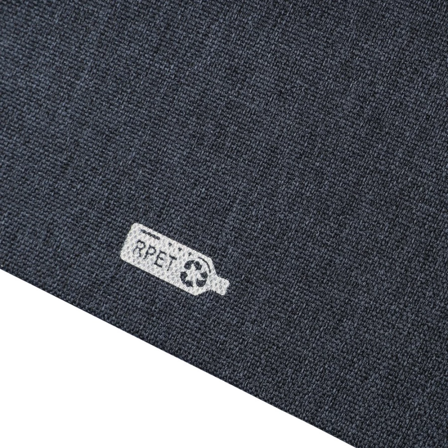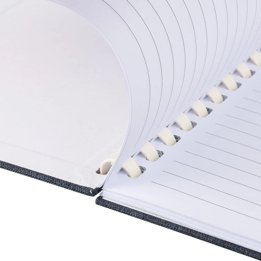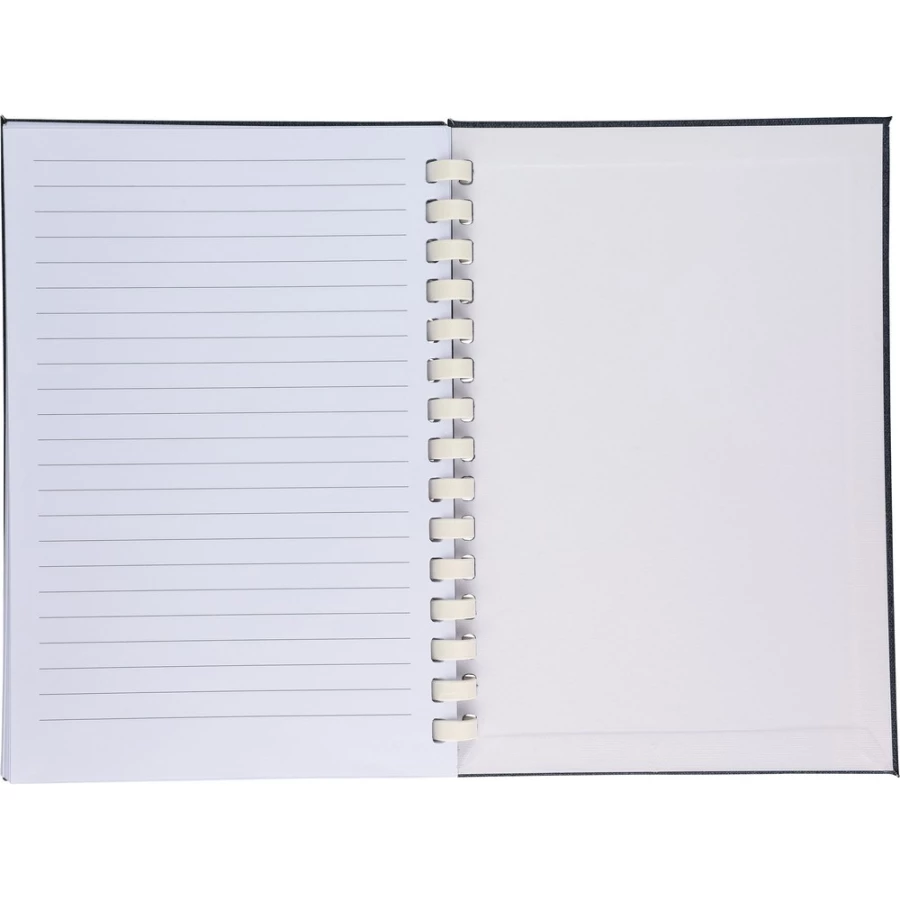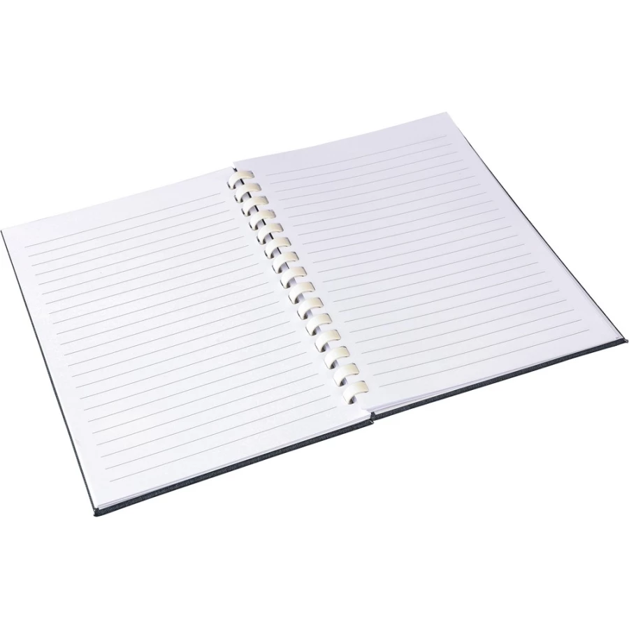 Notizbuch ca. A5, 80 linierte Seiten (70 g/m²), harte Umschlag, äußerer Gummiriemen, Lesezeichen‑Bändchen, RPET‑Symbol, Material: RPET.
