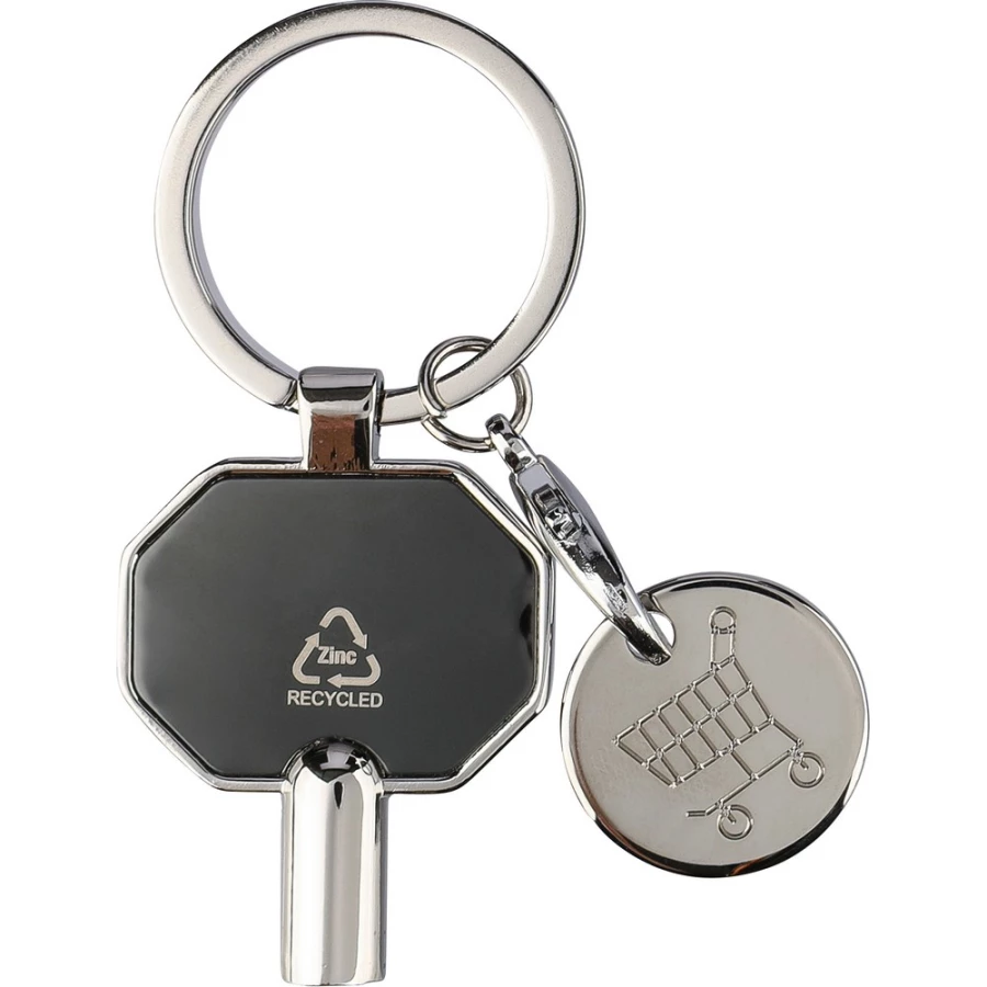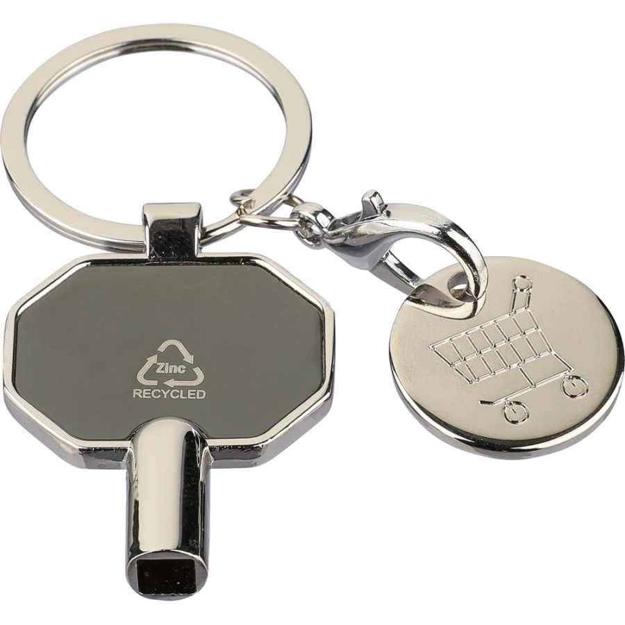 Schlüsselanhänger 3 in 1, enthält: Entlüftungsschlüssel für Heizkörper, Einkaufswagenchip, Schlüsselanhänger, Recycling-Symbol auf dem Produkt, einzeln verpackt in einem braunen Umschlag, Produkt aus Metall