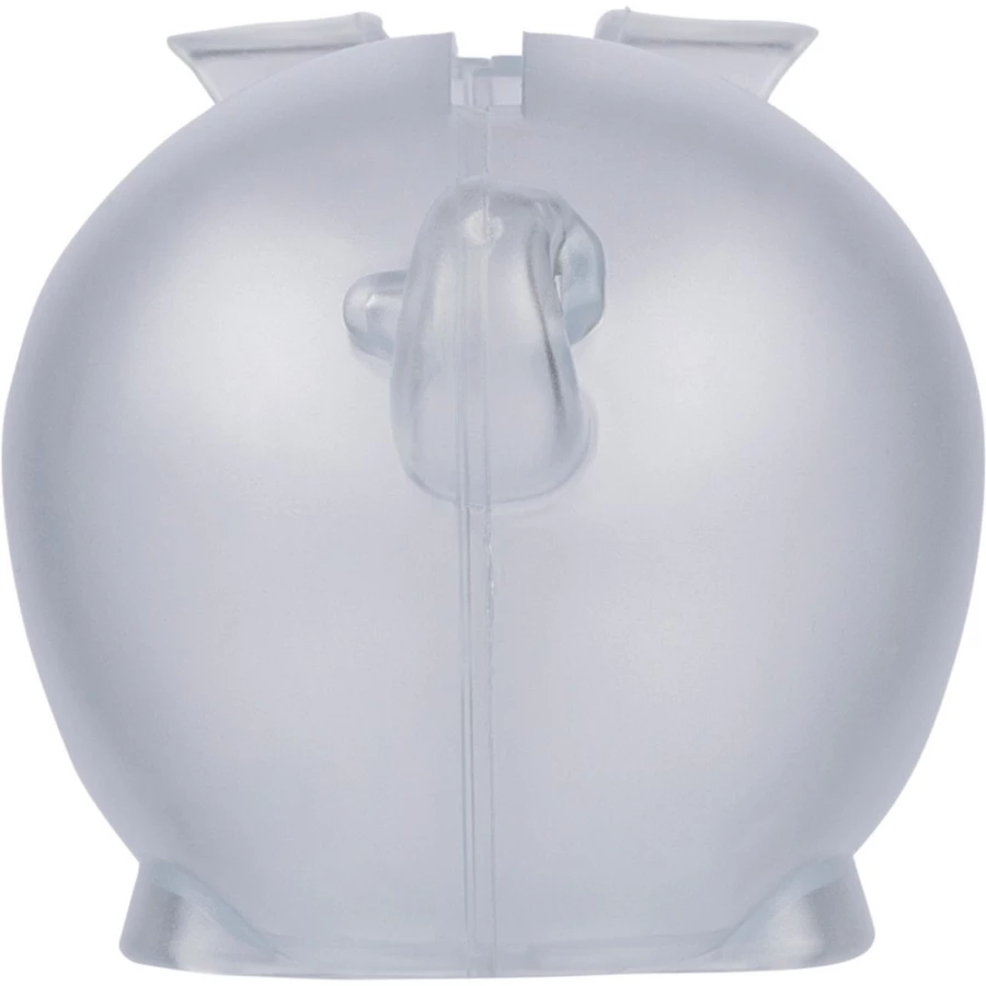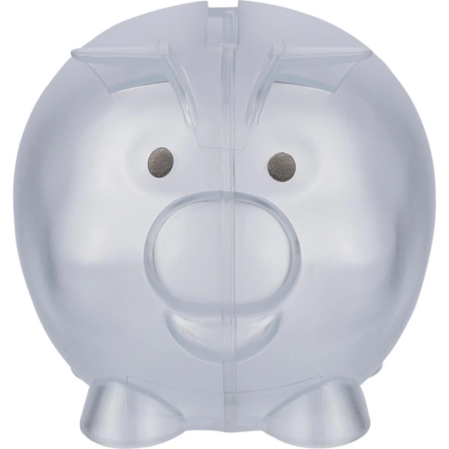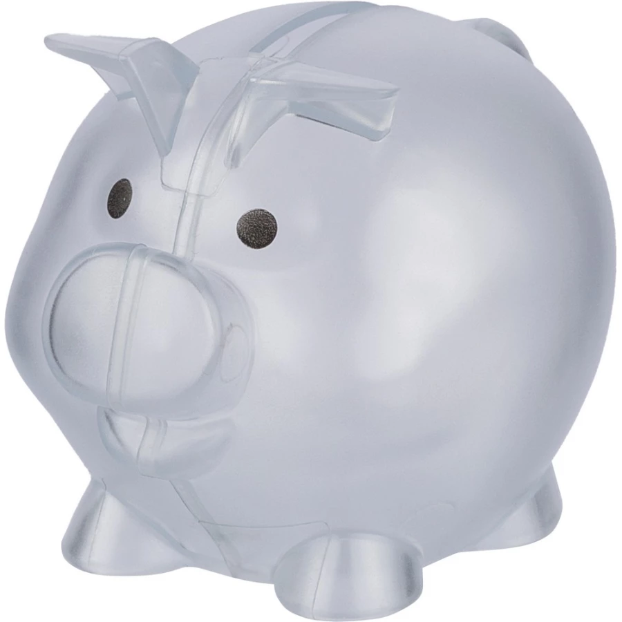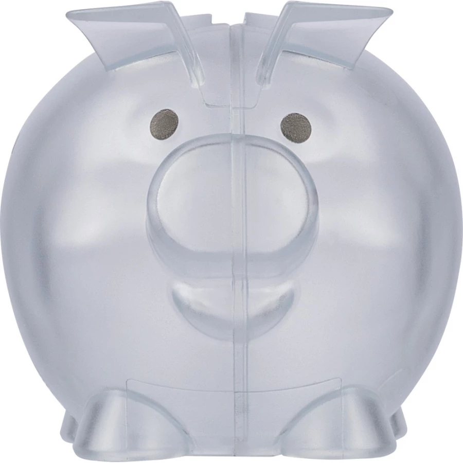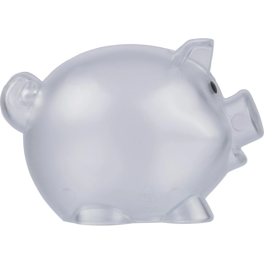 Sparschwein, Recycling-Symbol auf dem Produkt, verpackt in einem Beutel aus recyceltem Kunststoff, Produkt aus recyceltem Kunststoff