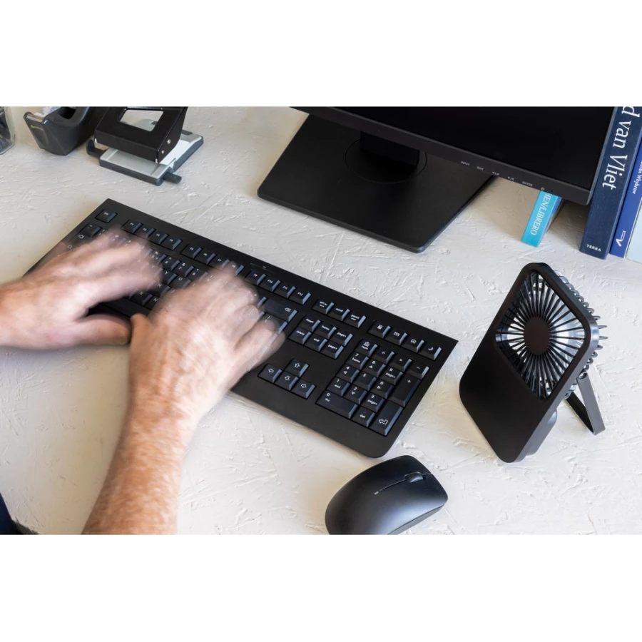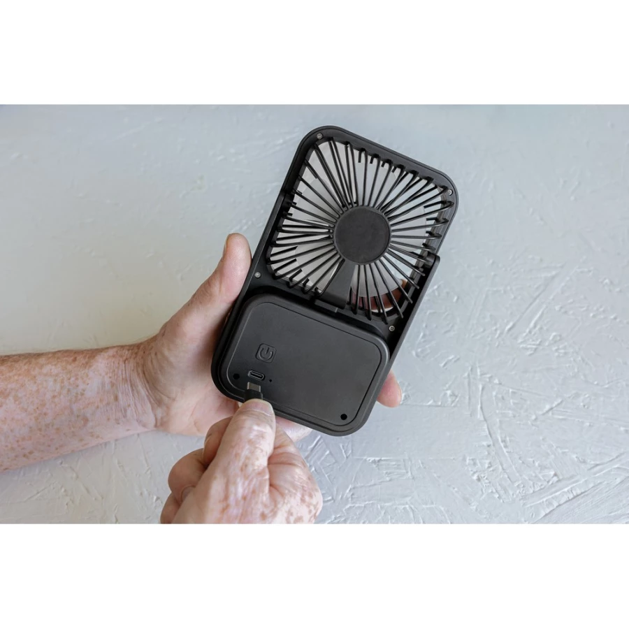 The Aervina desk fan, made from RCS certified recycled plastic, is a sleek and practical way to enjoy a refreshing breeze at home or in the office. Its modern black design combines style with function. The rechargeable 1200 mAh Li-ion battery provides up to 3 hours of working time and recharging in 4 hours via the included 120 cm black TPE USB-A to USB-C cable. With three adjustable speed levels and an adjustable stand, the Aervina fan offers flexible comfort wherever you need it. Made from RCS certified recycled ABS plastic. ...