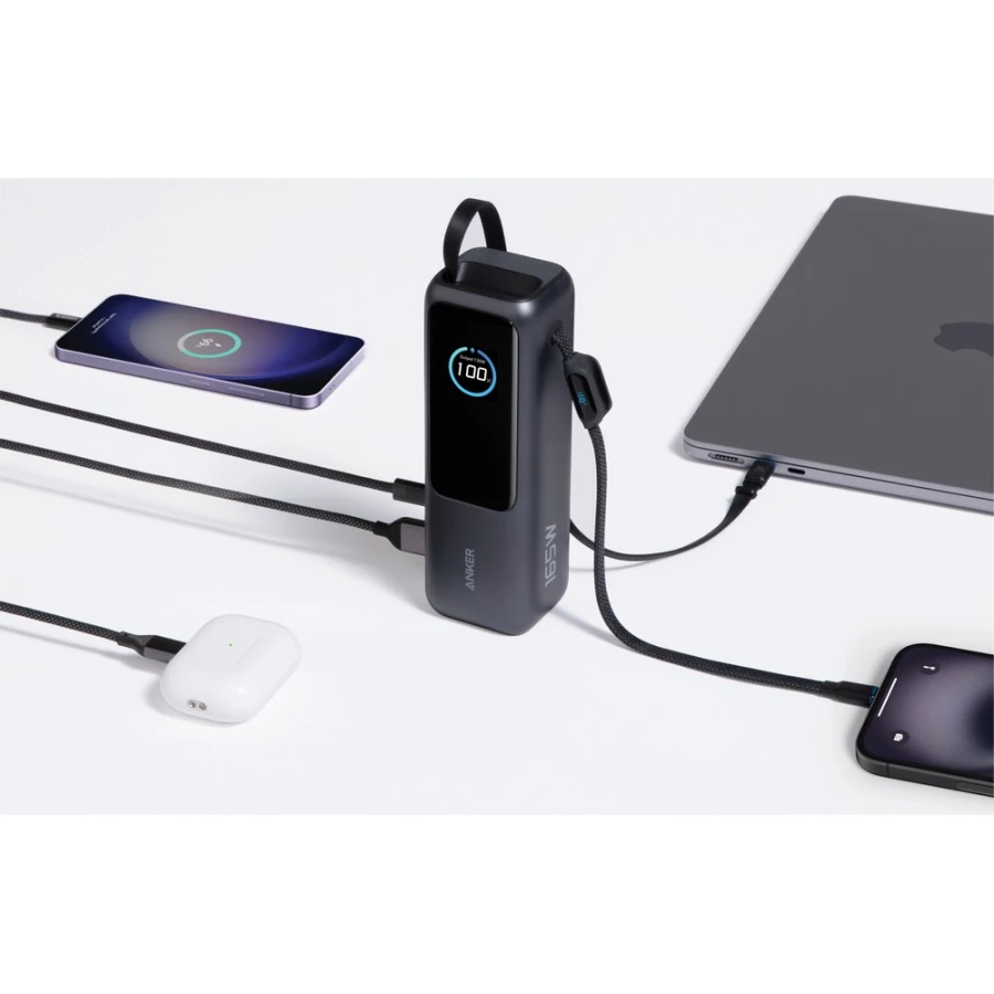 USB-A and USB-C ports, all while staying informed with a smart digital display that shows real-time power and battery status. With Anker’s advanced ActiveShield 2.0 for safe charging and a compact, rugged design, this powerbank is ideal for work, travel, or daily use when performance and convenience matter most.