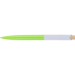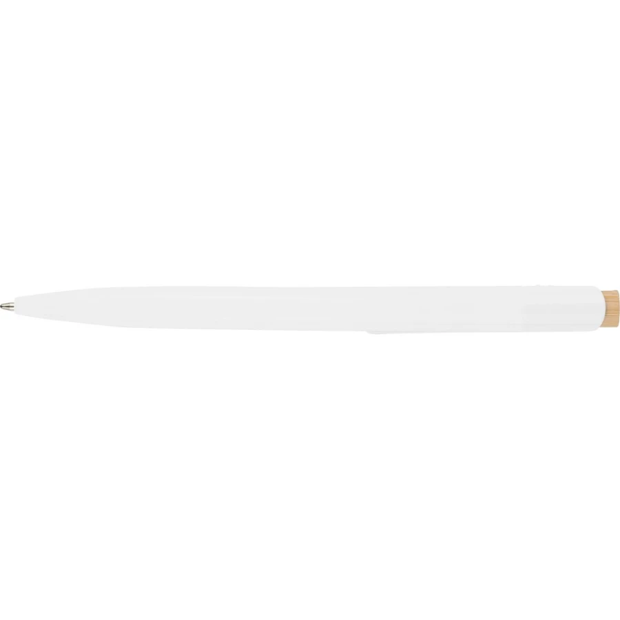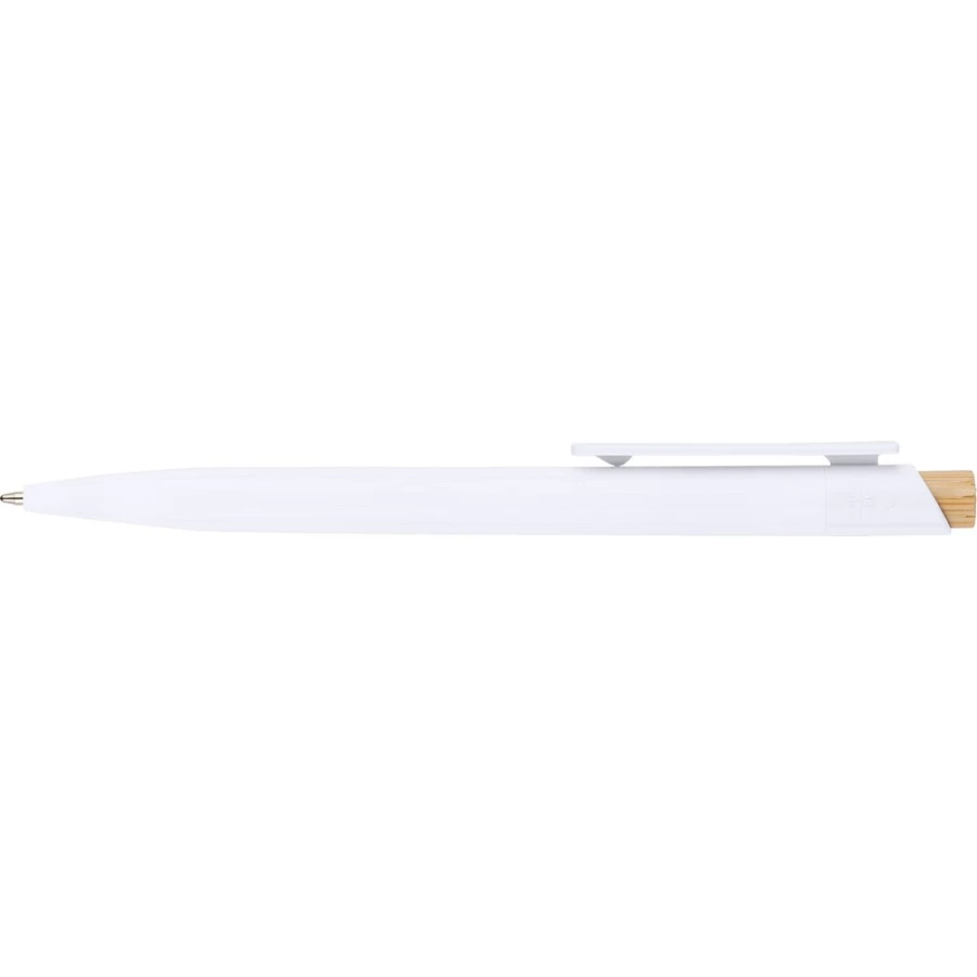 Ball pen, bamboo pusher, metal clip, writes in blue, includes recycled icon on product, approx. 600 m writing length, product made from recycled ABS, bamboo and aluminium