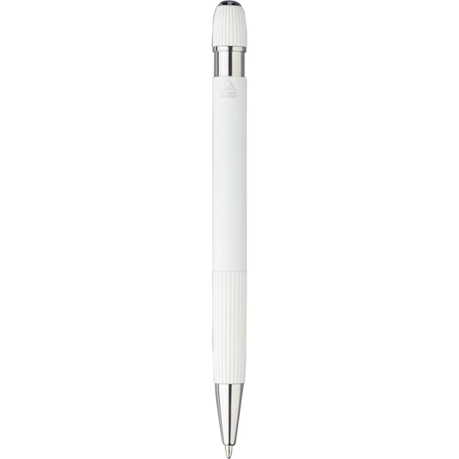 Ball pen made of aluminium, rubberized finish, striped details on the grip and topside, chromed plastic tip, and push button with metal clip, blue ink, includes recycling icon on the product