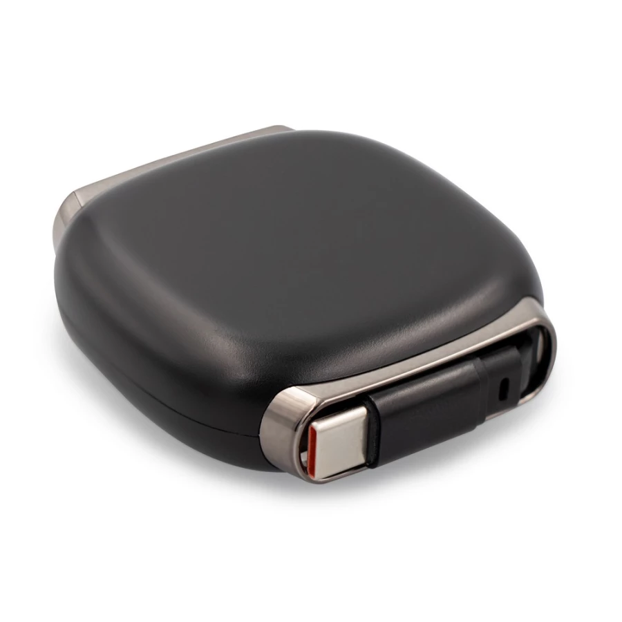 Retractable cable in a square housing, USB-C to USB-C connector, supports charging and data transfer, compact design, charging voltage and current: DC 5V/9V/12V/15V/20V, max 5A, max 100W, average data transfer speed: 35 MB/s, adjustable cable length, max 1m