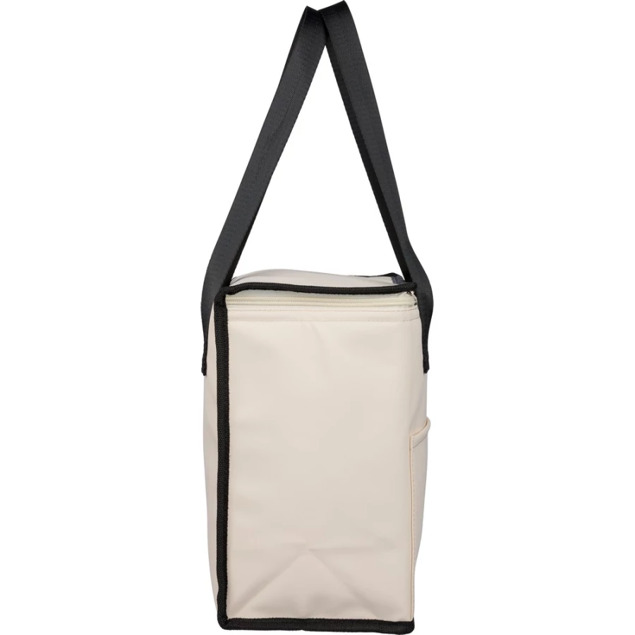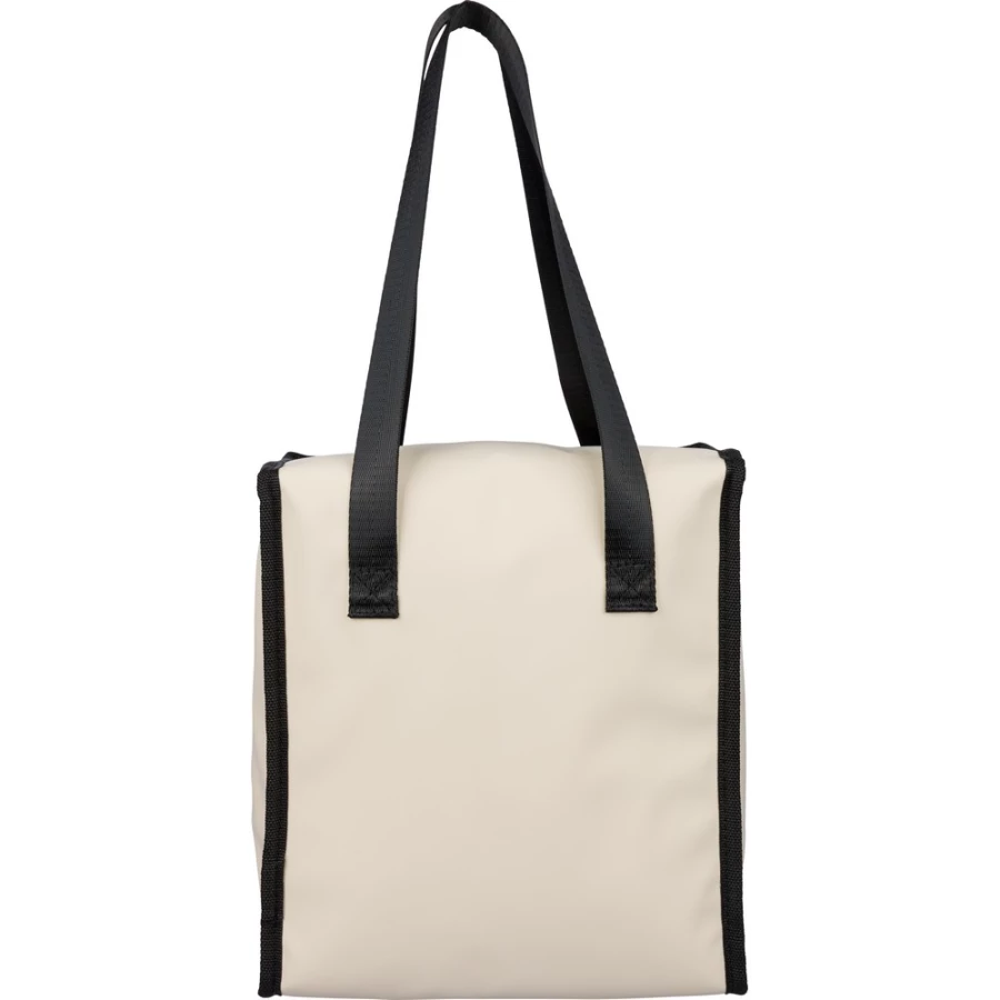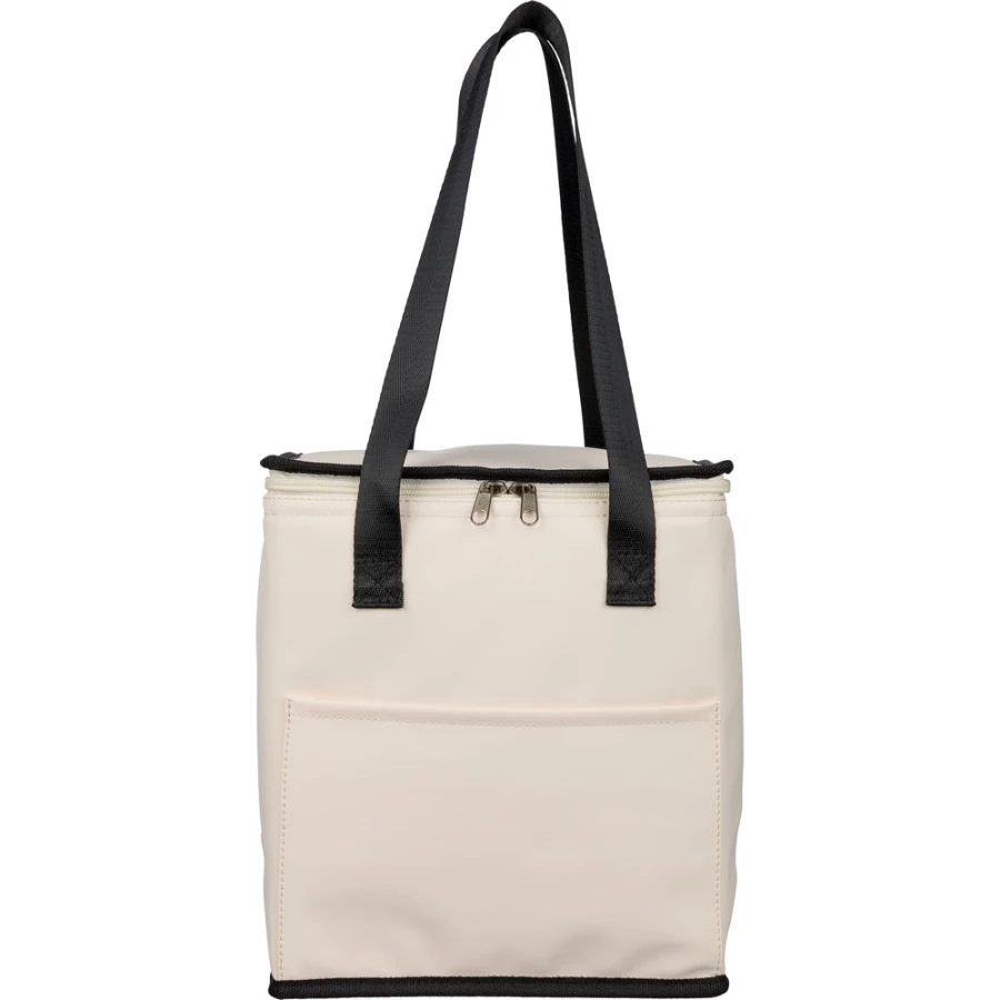 Cooler bag with a capacity of 9 litres, with long shoulder handles (2.5 × 66 cm), front pocket, includes recycling icon on the tag, product made from recycled PU with polyester lining