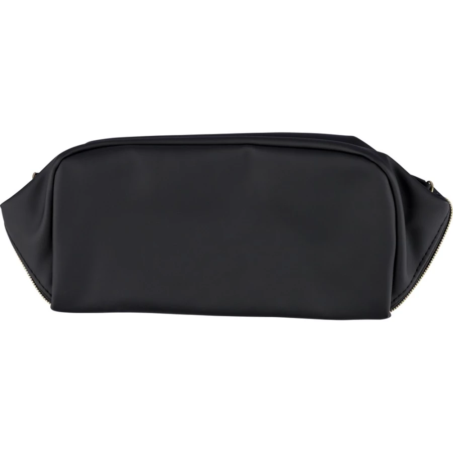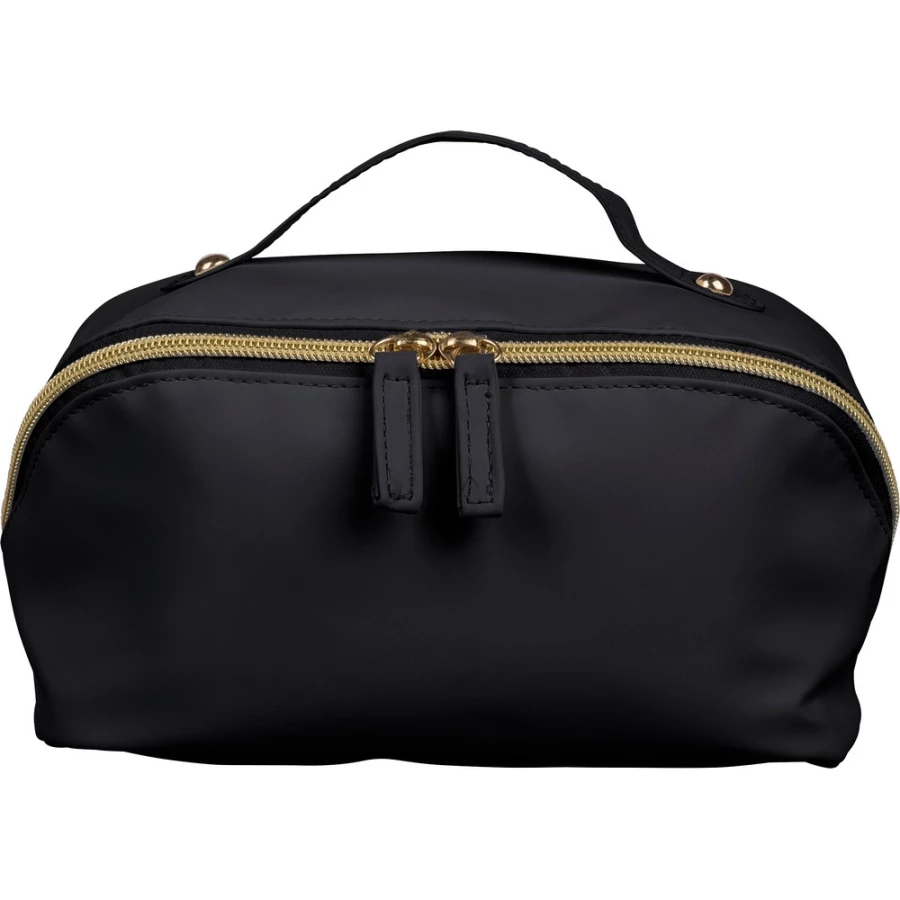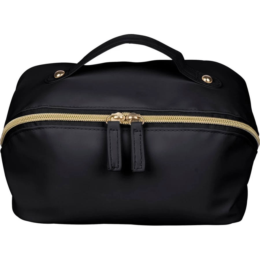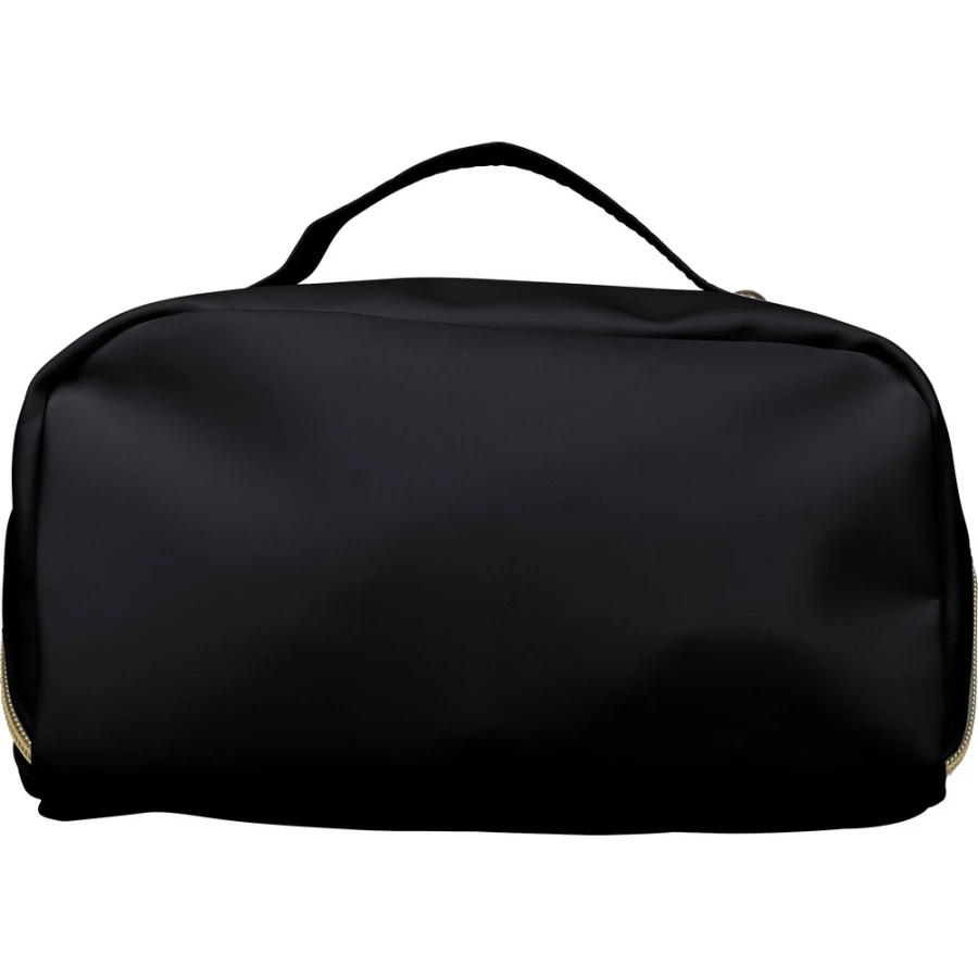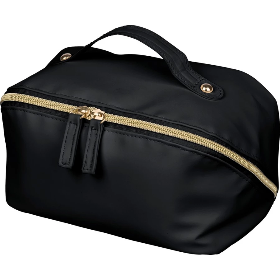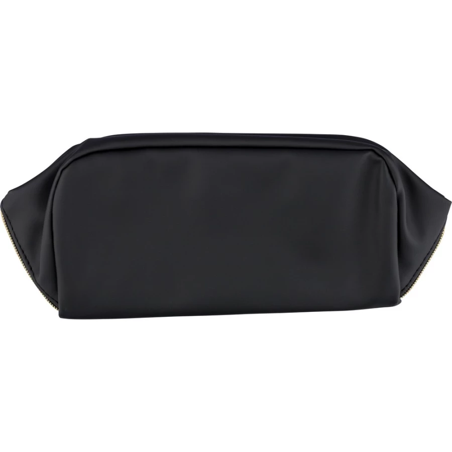 Zippered cosmetic bag, short carrying handle, 210D polyester lining inside, large zippered compartment, small zippered pocket inside, includes recycled icon on a tag, product made from recycled PU and polyester