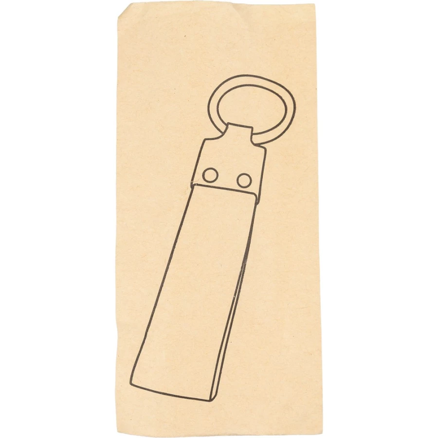 Metal keychain with denim strap for an easier carrying, packaged in craft paper sleeve