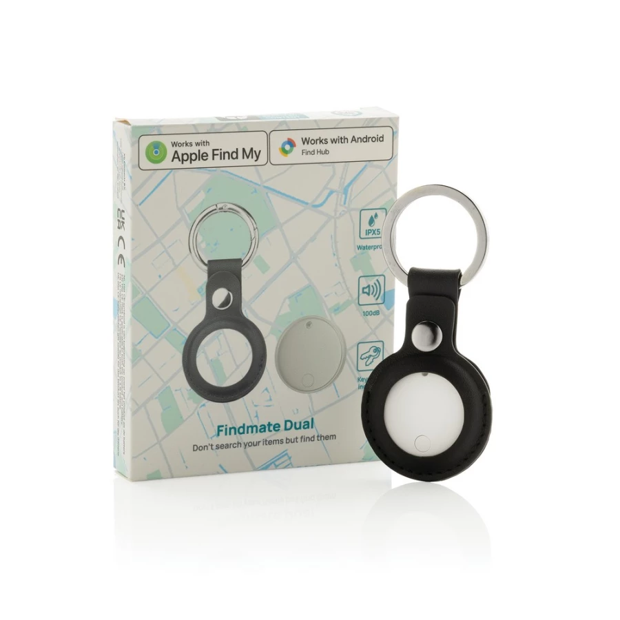 pped with an extra-loud 100 dB alarm and an integrated speaker for beeping signals, Findmate Dual makes close-range recovery effortless.Its IPX5 waterproof rating guards against splashes and rain, while the luxury PU keychain holder ensures both durability and style. Activate Lost Mode to receive notifications when you leave your belongings behind, and enjoy up to one year of battery life (replaceable CR2032). Made out of RCS certified recycled ABS plastic.FSC packaging.