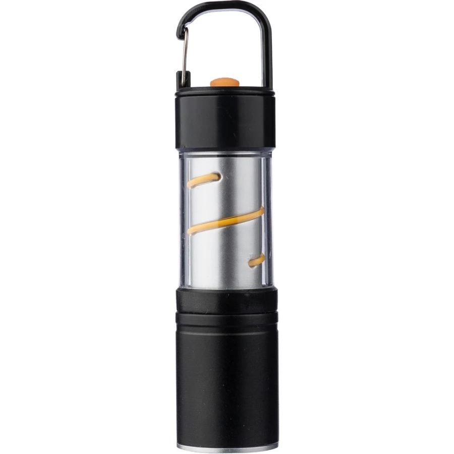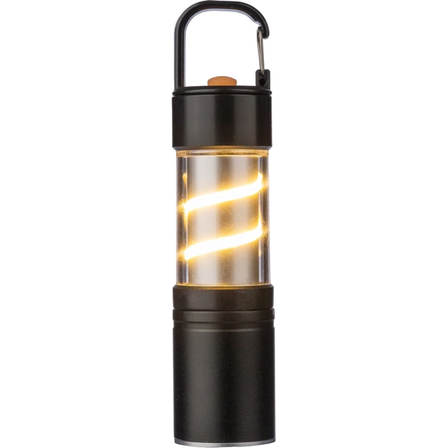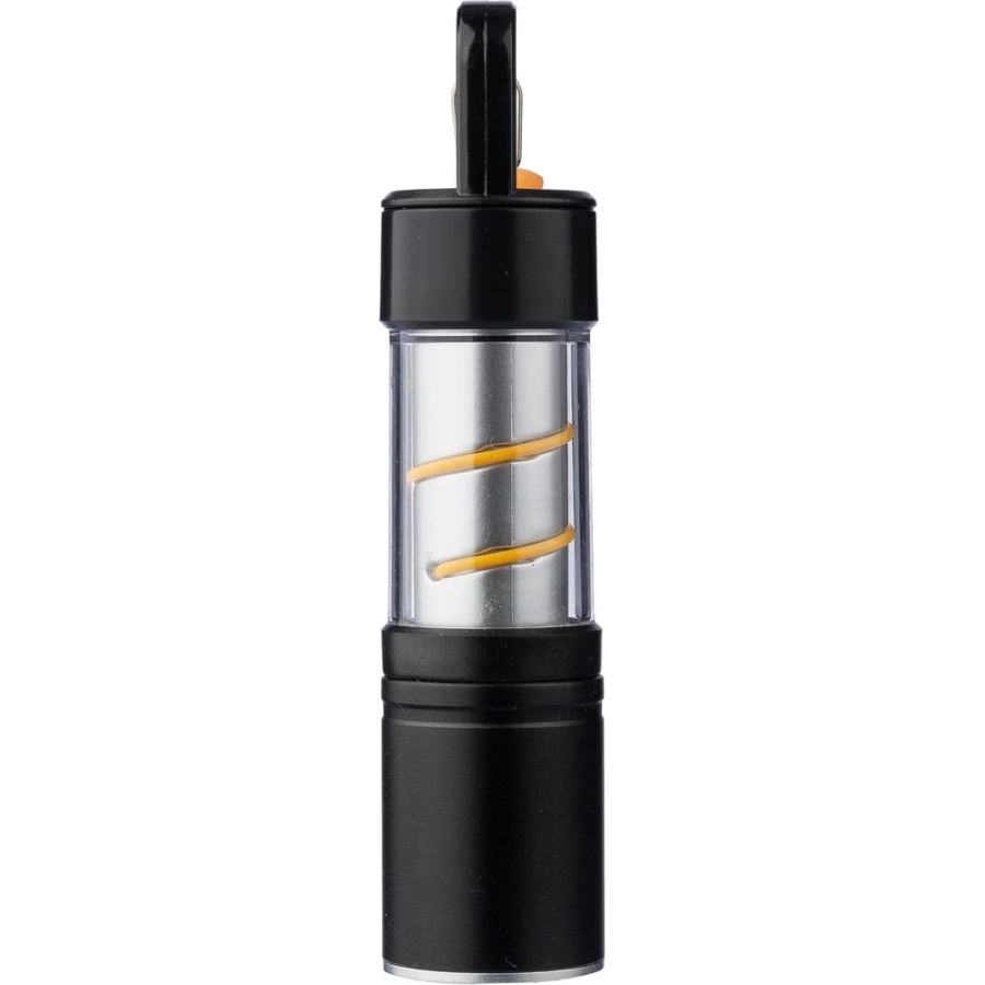 Flashlight COB with carabiner clip for attaching, 3 light modes, zoom mode, push button, magnetic base, rechargeable via USB-C port, 30 cm black cable included, packaged in brown cardboard box, product made of ABS and metal