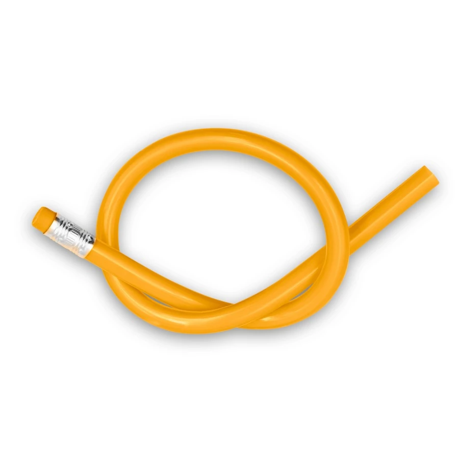 Long flexible pencil with glossy finish and matching eraser. Its bendable design is more resistant to breaking and can help relieve stress. Tip not sharpened, product made of PVC