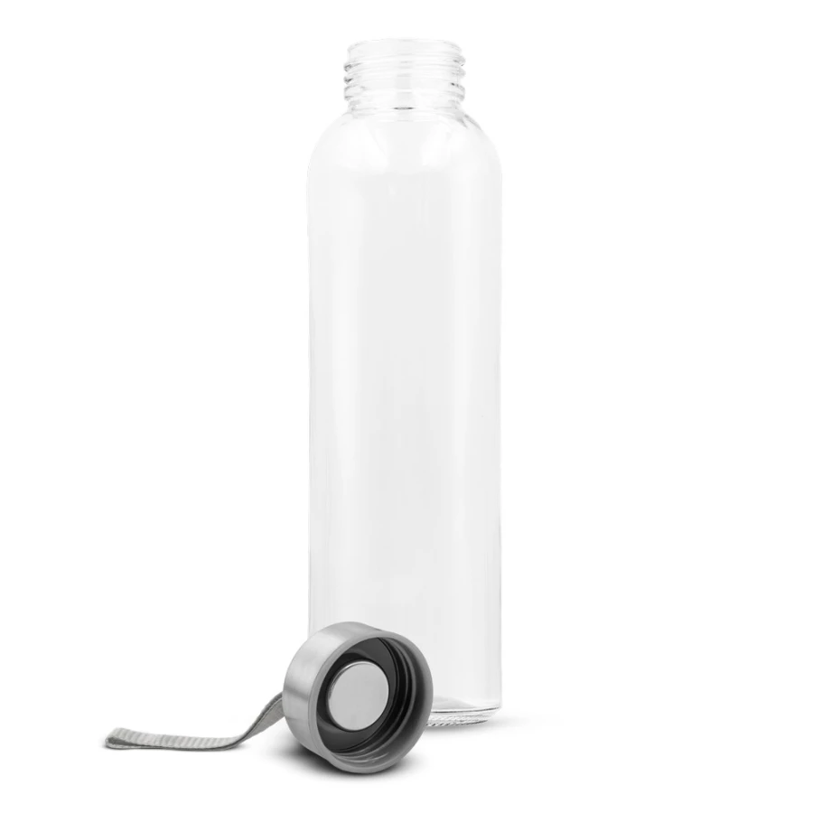 Glass bottle 500 ml, features lid in silver colour with attached band for easier carrying, product made of glass and stainless steel