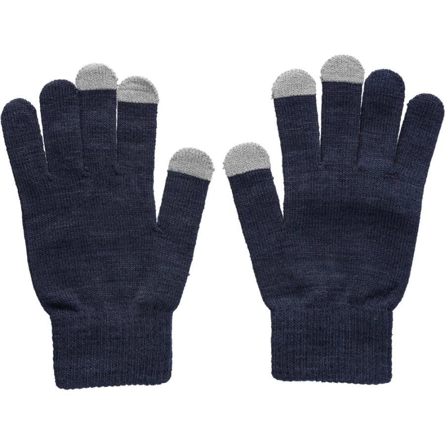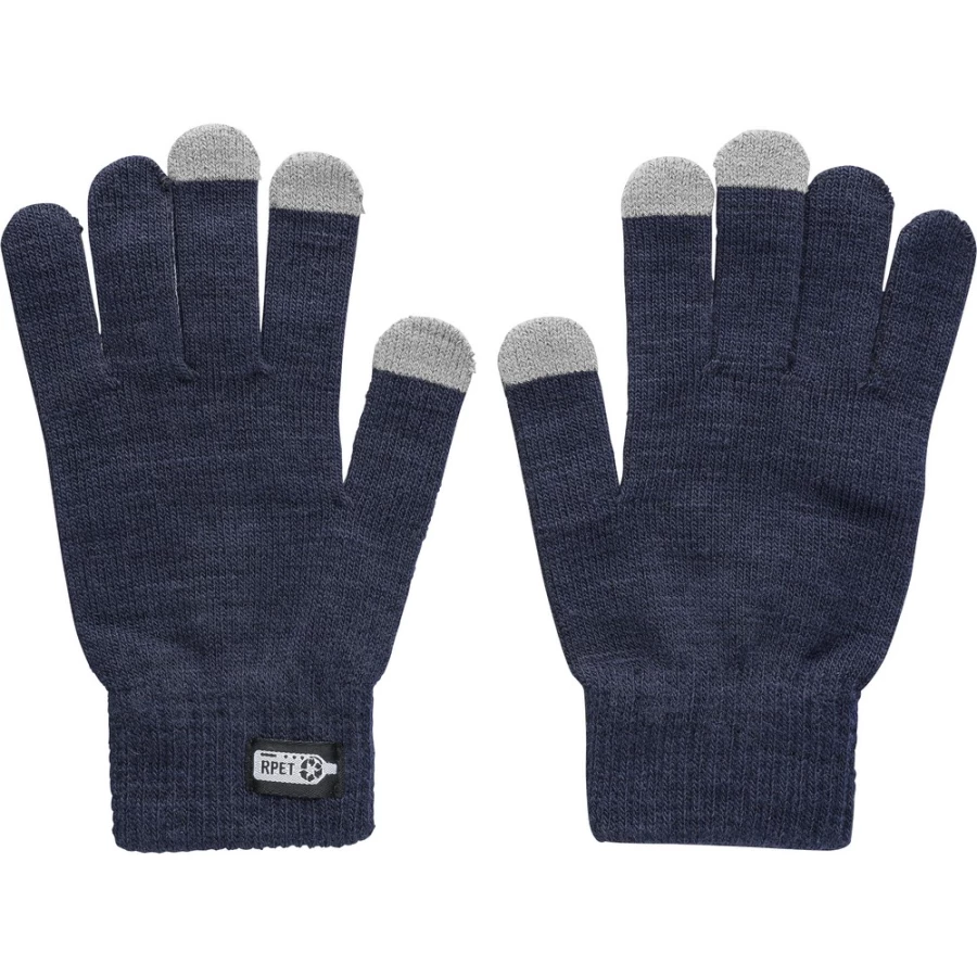 Gloves with 3 special fingertips for touchscreen devices, RPET label on the outside, washing label on the inside, product made of RPET and elastane
