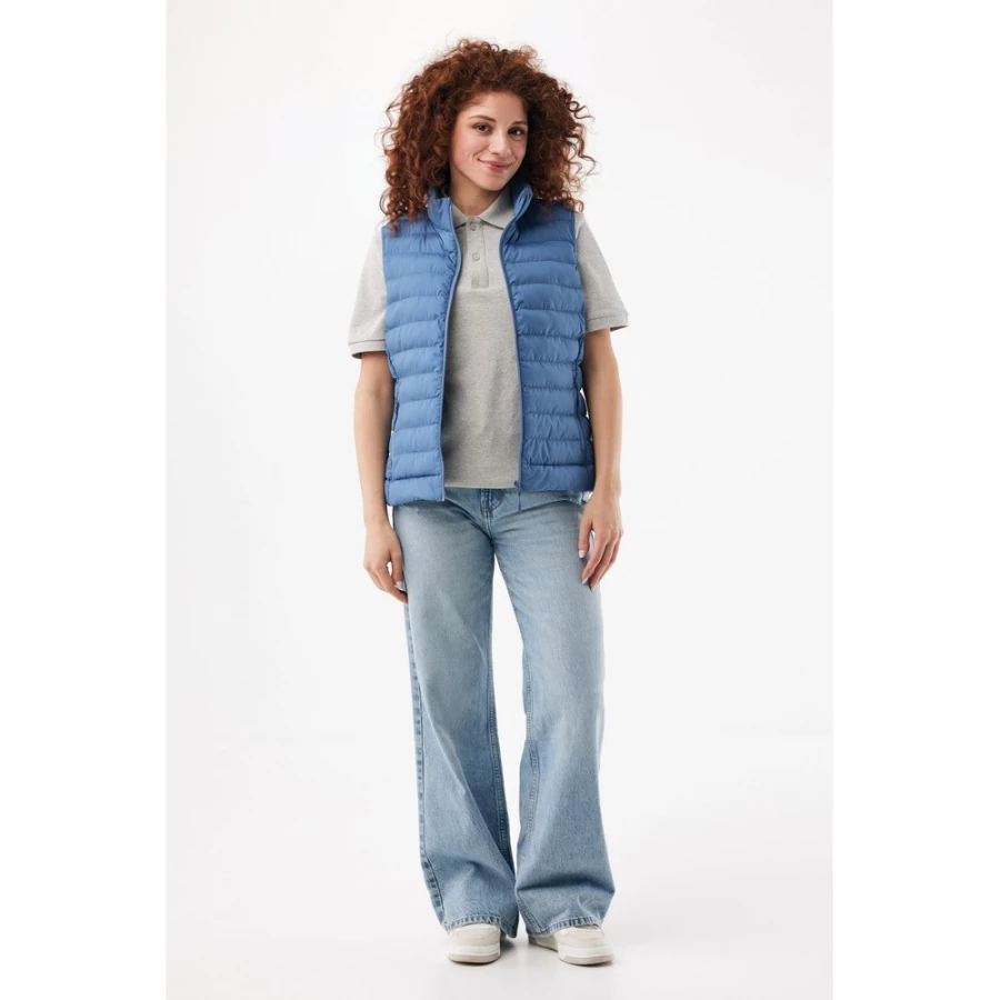 Women’s medium fit bodywarmer made from 100% post-consumer recycled polyester. The bodywarmer is fully quilted with 100% recycled polyester pearl filling. It has a reversed zipper at the front and practical zip pockets in the side panel seams. All zippers have extra zip pullers in matching colour for a refined look. The armholes have elastic binding and all seams at the inside are clean finished with recycled binding. Fluorine/PFAS free water repellent impregnation. The use of genuine recycled fabric materials and environme ...