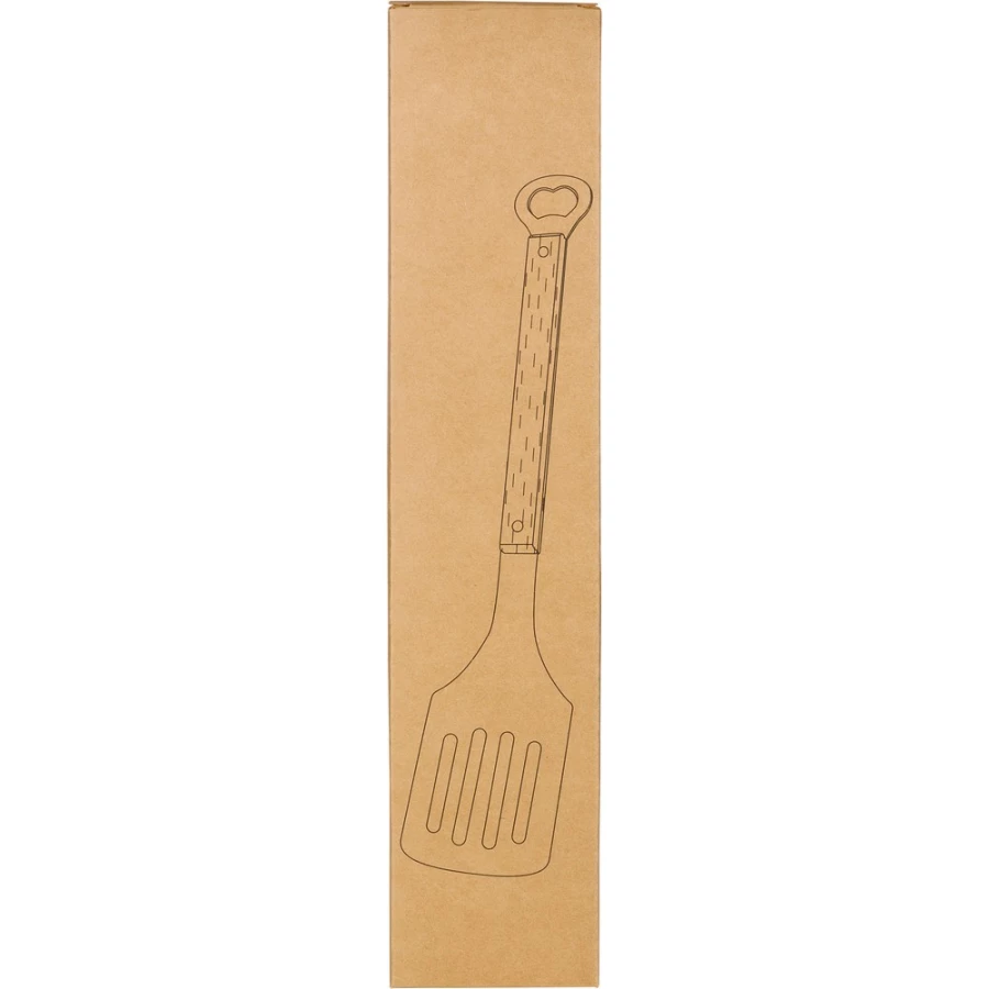 Kitchen spatula with bottle opener function, wood handle, packed individually in carton box, product made of stainless steel 430/410 and beechwood
