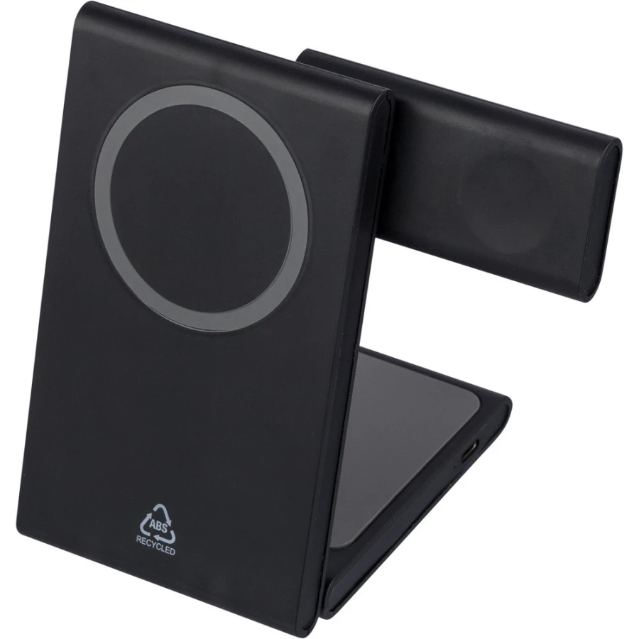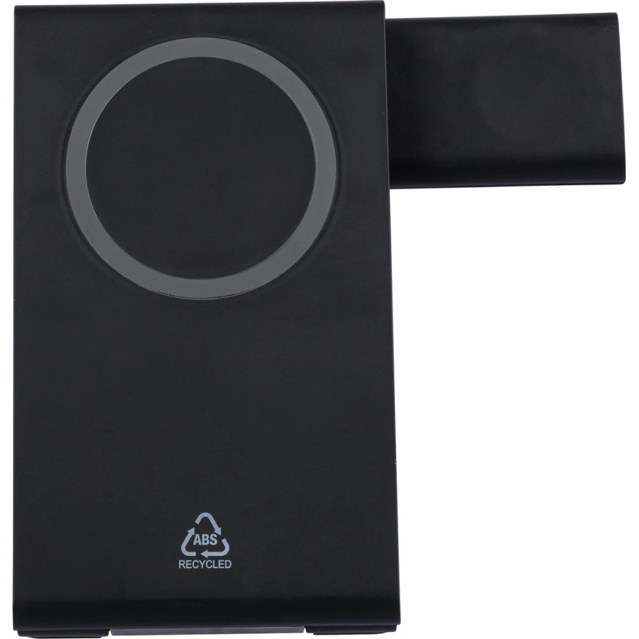 Magnetic wireless charger 3 in 1, 15W, phone charger smartwatch charger 2W, air pods charger 2W, compatible with iOS devices, input: 5V/3A, 9V/3A, output: 5V/1A, 9V/1.1A, 9V/1.67A, includes recycled icon on product, packed per piece in brown carton box, product made from recycled ABS