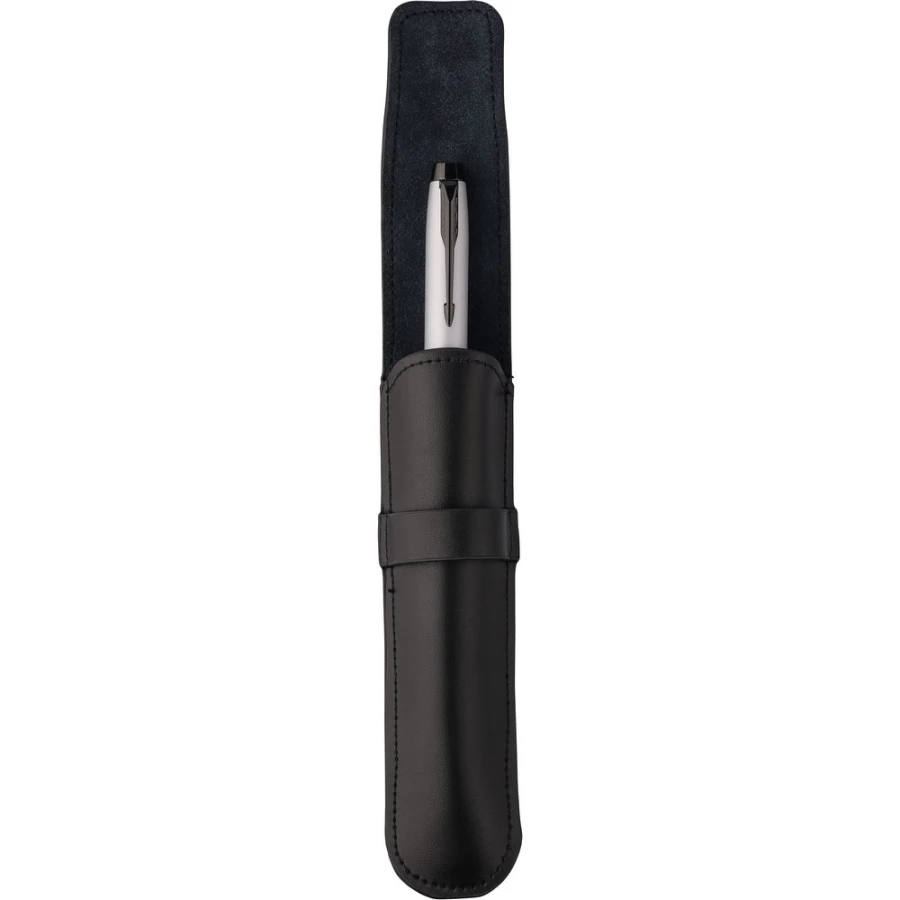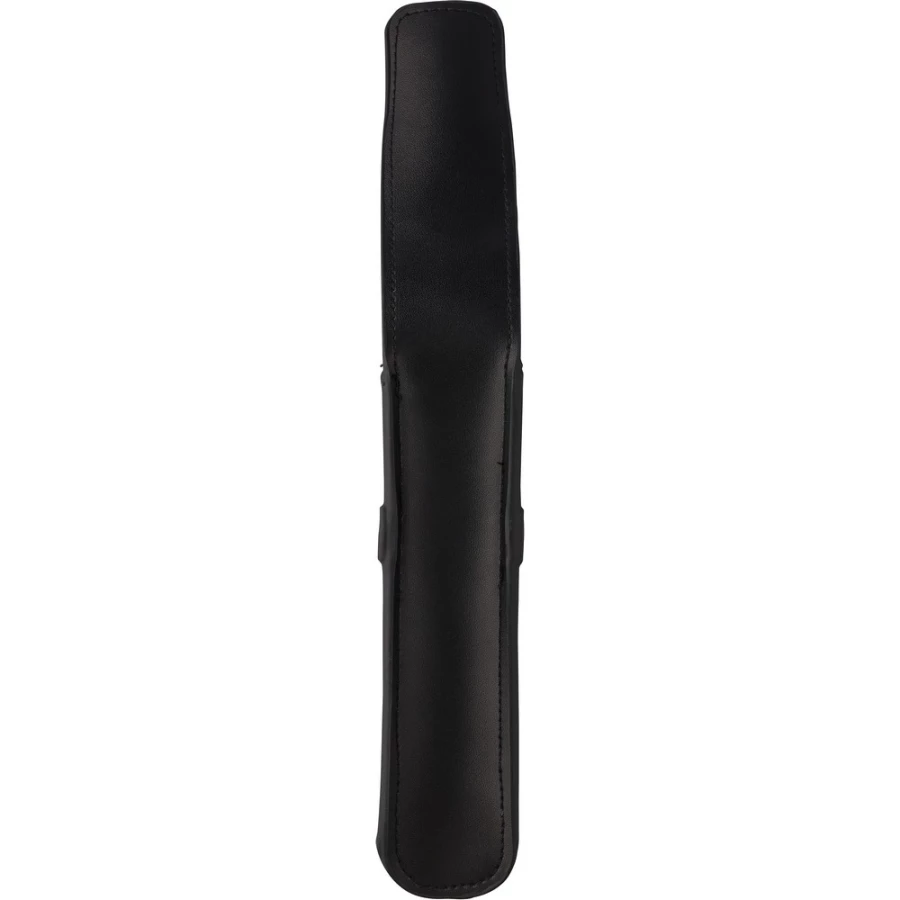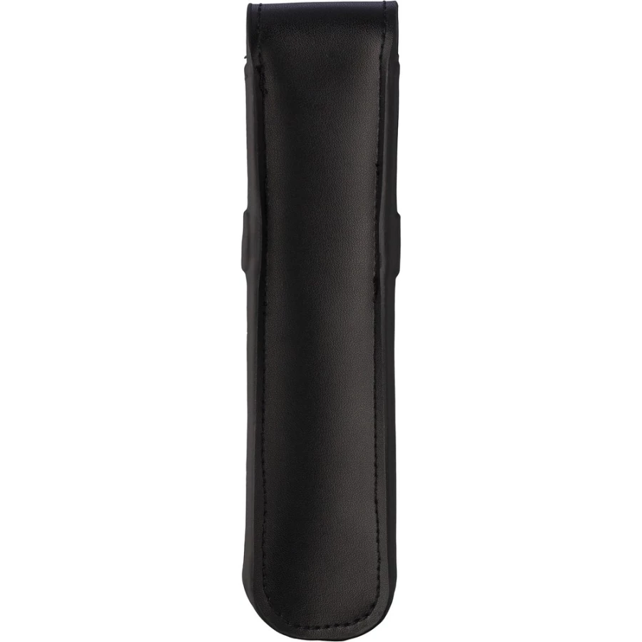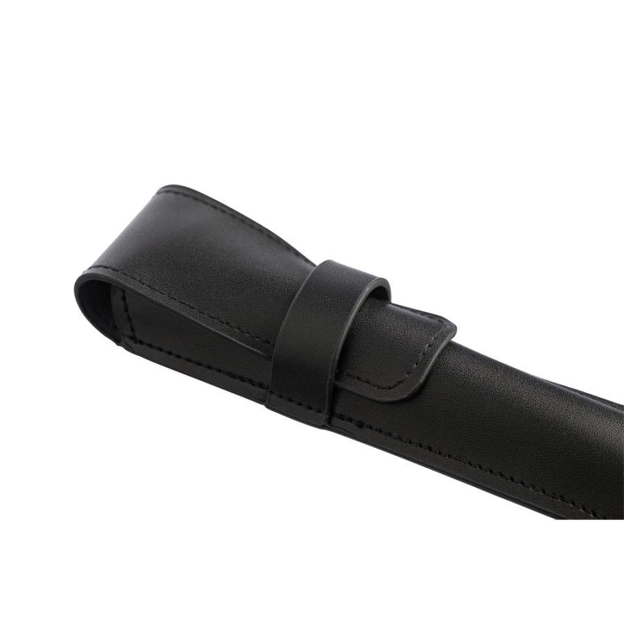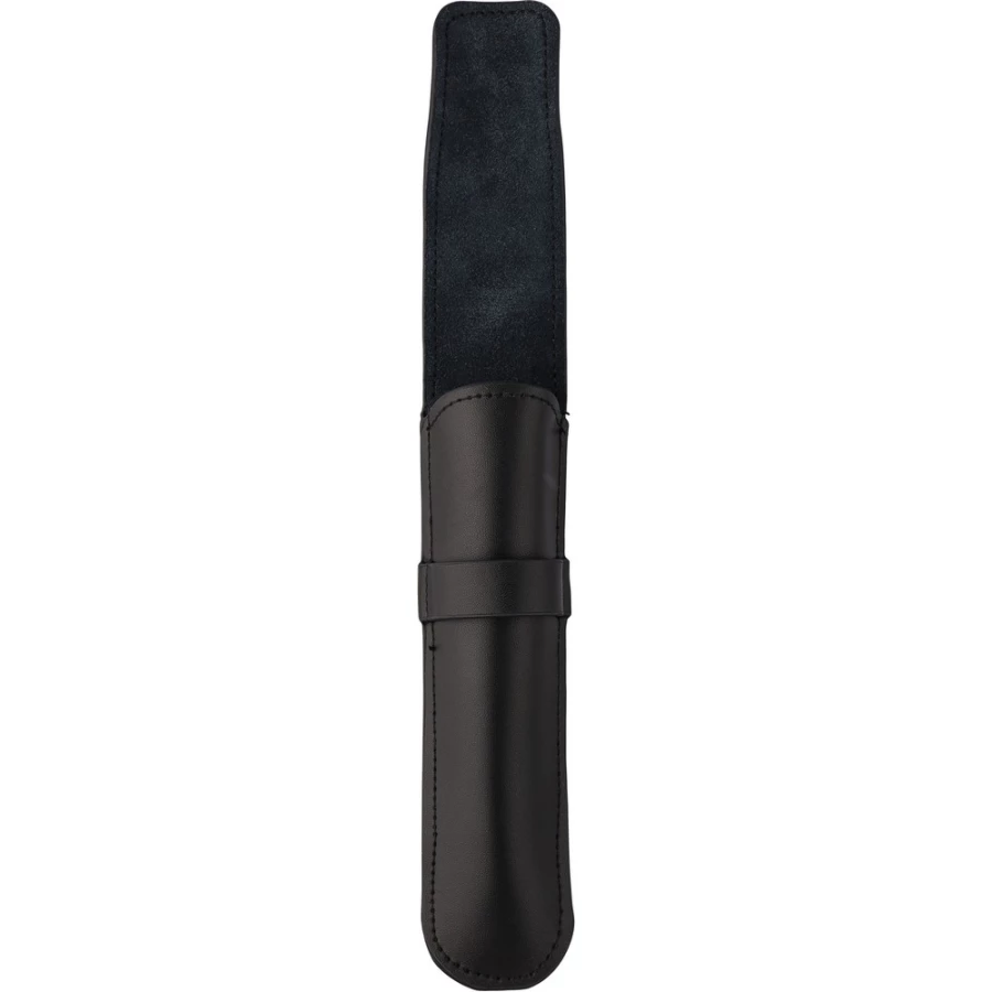 Double-layered leather pen pouch with flap and belt-style closure, soft interior, packaged in paper sleeve
