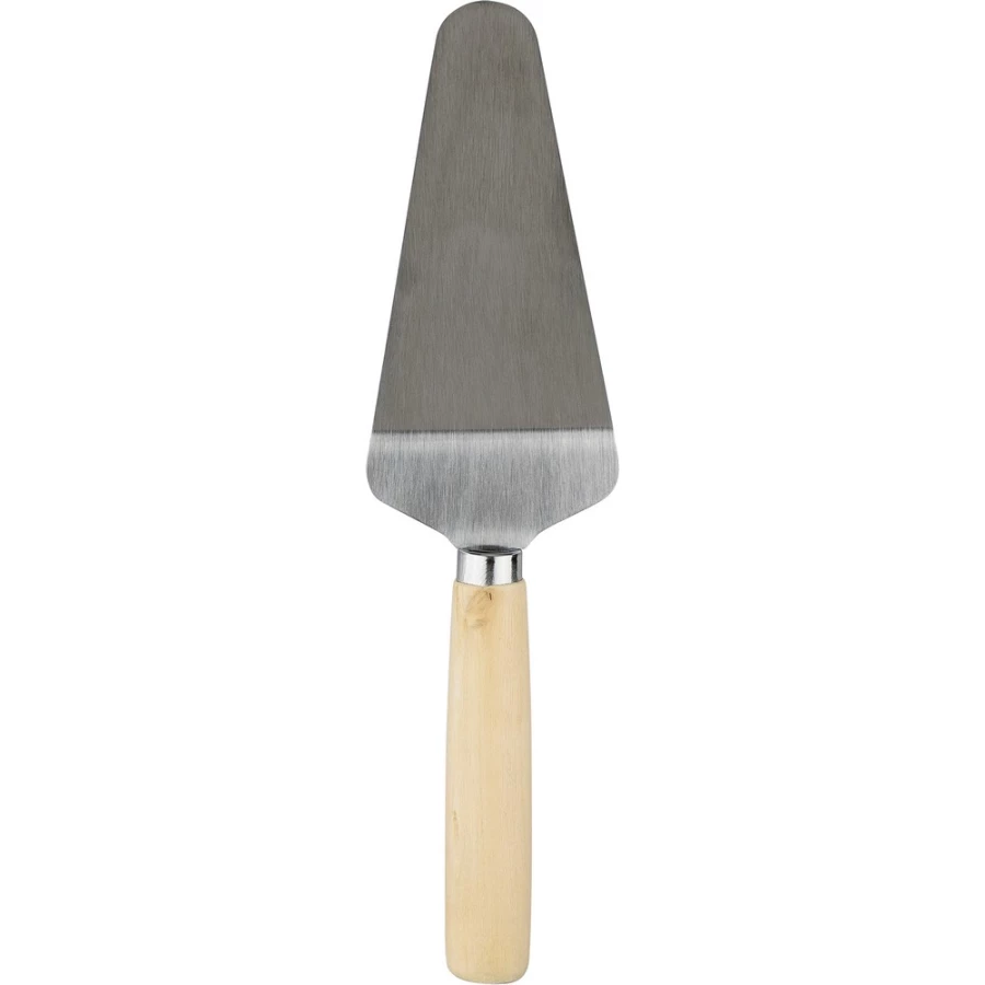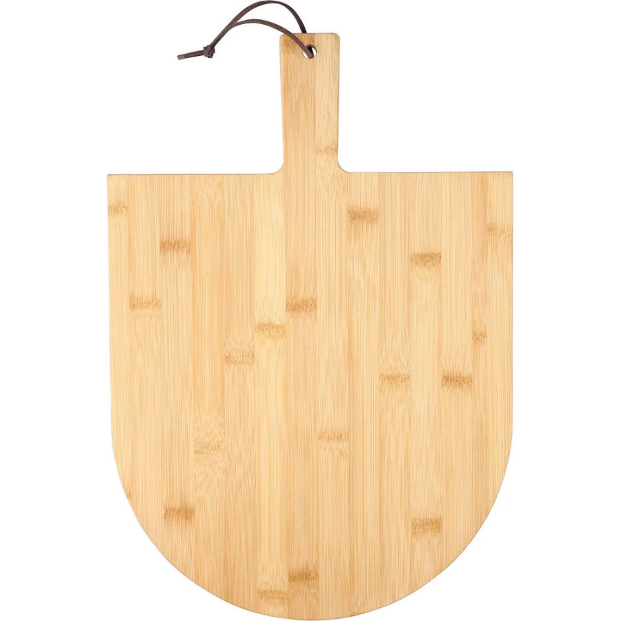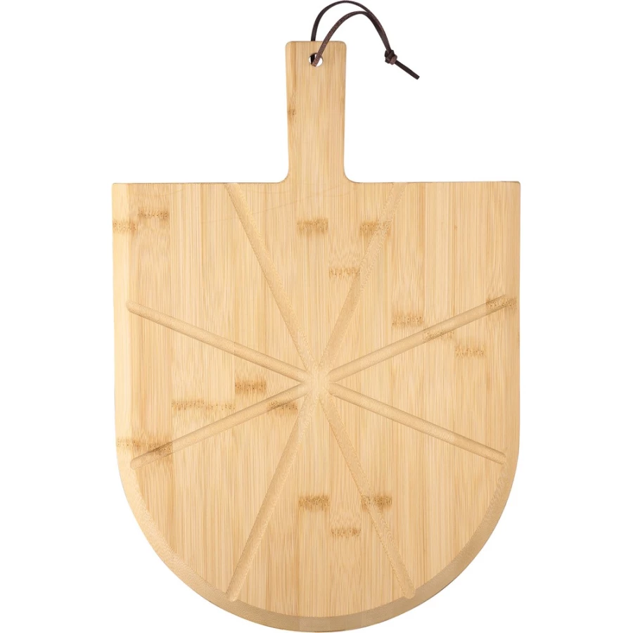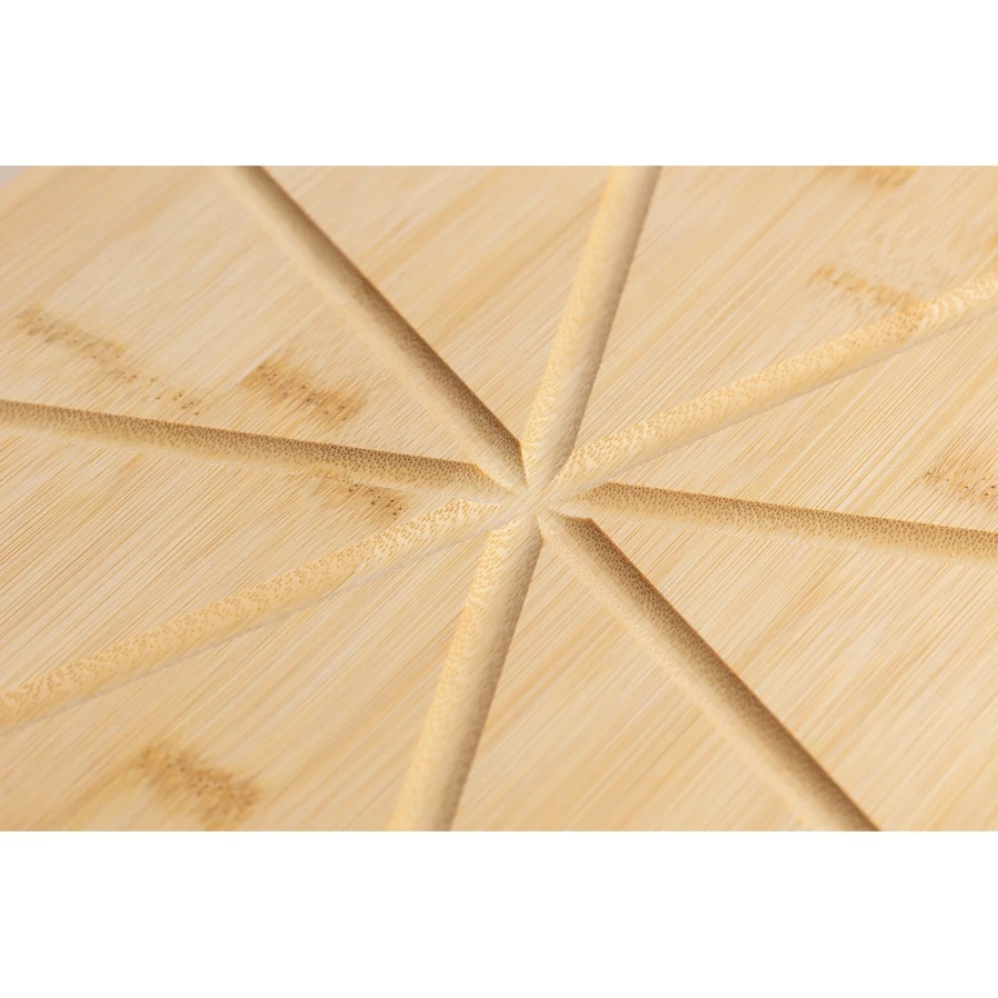 Pizza serving set, cutting board with hanging cord and pre-cut slice guides for an easier serving, pizza slicer and spatula, packaged in brown cardboard box, product made of bamboo and metal