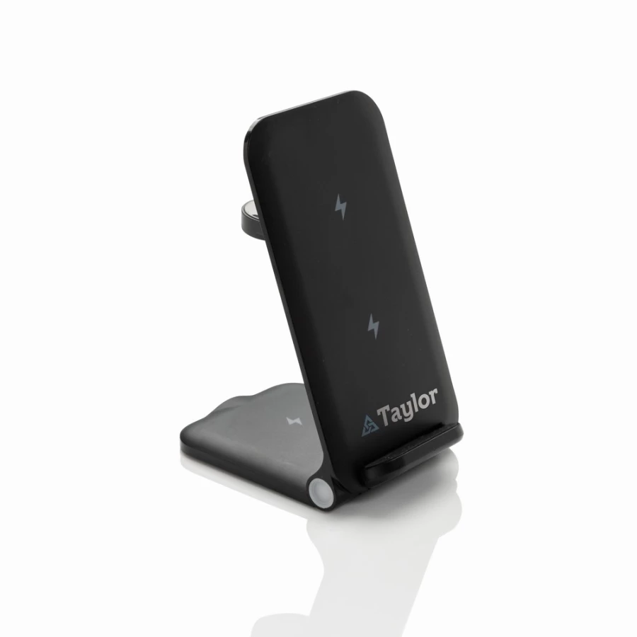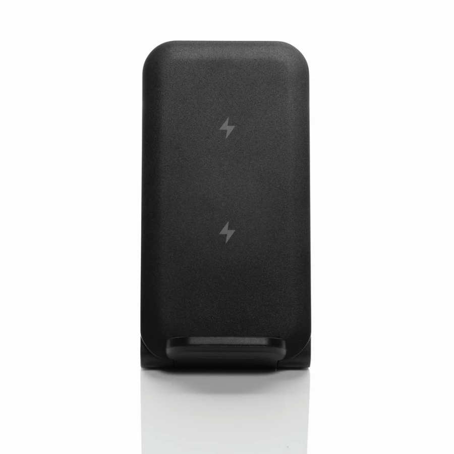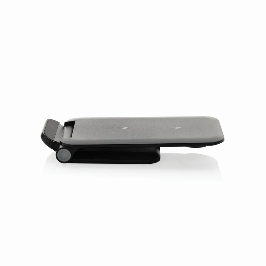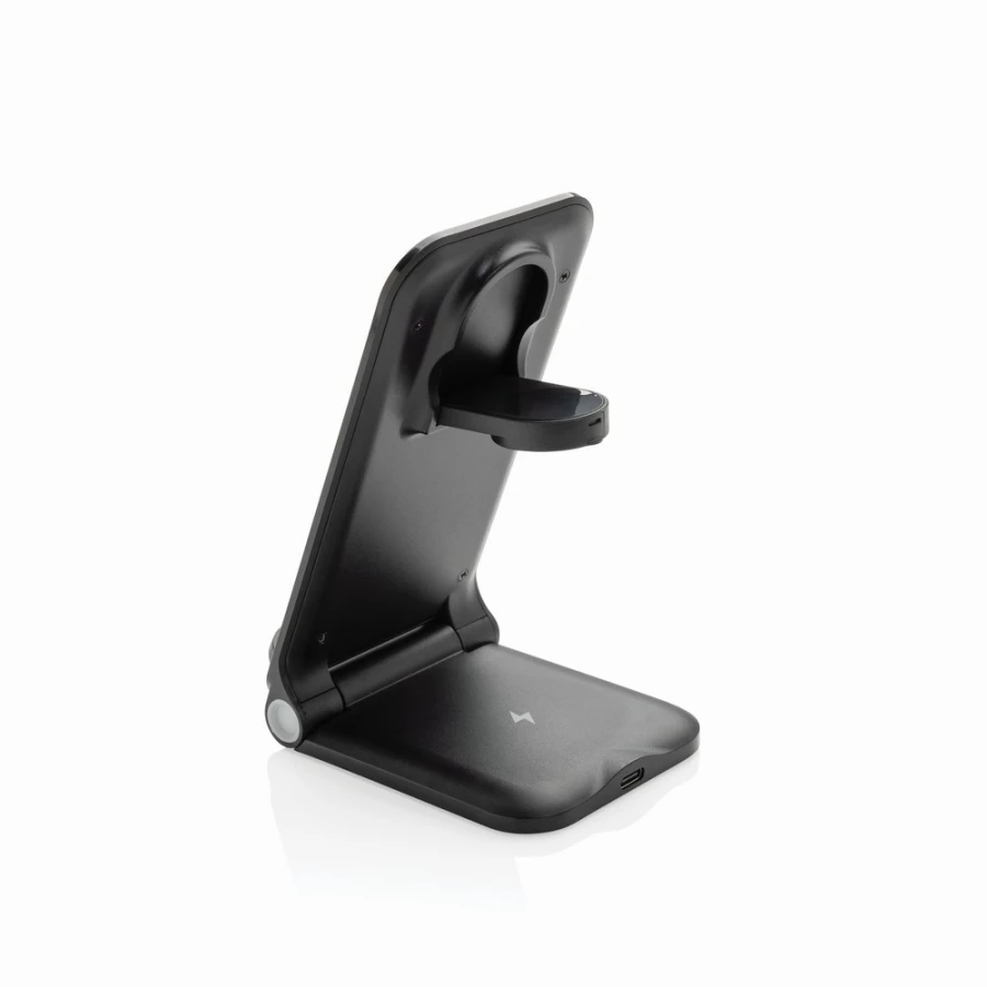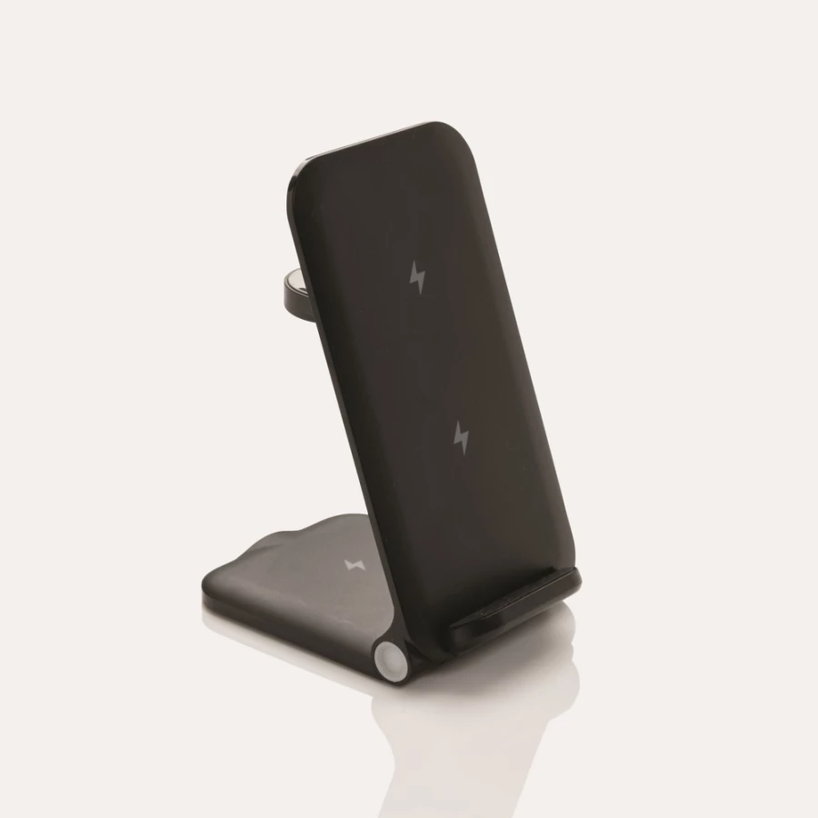3-in-1 wireless charger stand made with RCS recycled ABS. Total recycled content: 51% based on total item weight. RCS certification ensures a completely certified supply chain of the recycled materials. The wireless charger comes equipped with a 15W wireless charger and an additional 5W wireless charger suitable for earbuds cases or other small wireless chargeable devices and a 2.5W wireless charger for smartwatches ( Apple watches only). Foldable design so easy to take with you. Including RCS certified 120 cm recycled TPE ca ...
