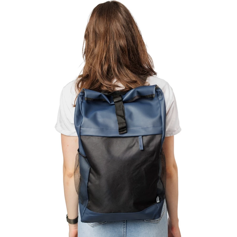 Roll-top laptop backpack with adhesive closure, 5 pockets including one for a 15" laptop, load capacity: 25 l, load capacity: 15 kg, PU waterproof coating, RPET label on the side, includes RPET icon on the tag, product made of RPET