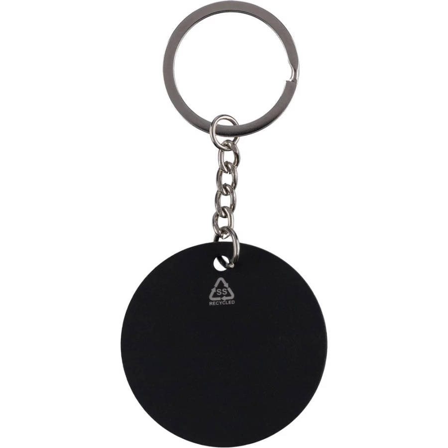 Round keyring, includes recycled icon on product, packed in craft paper envelop, product made of recycled stainless steel