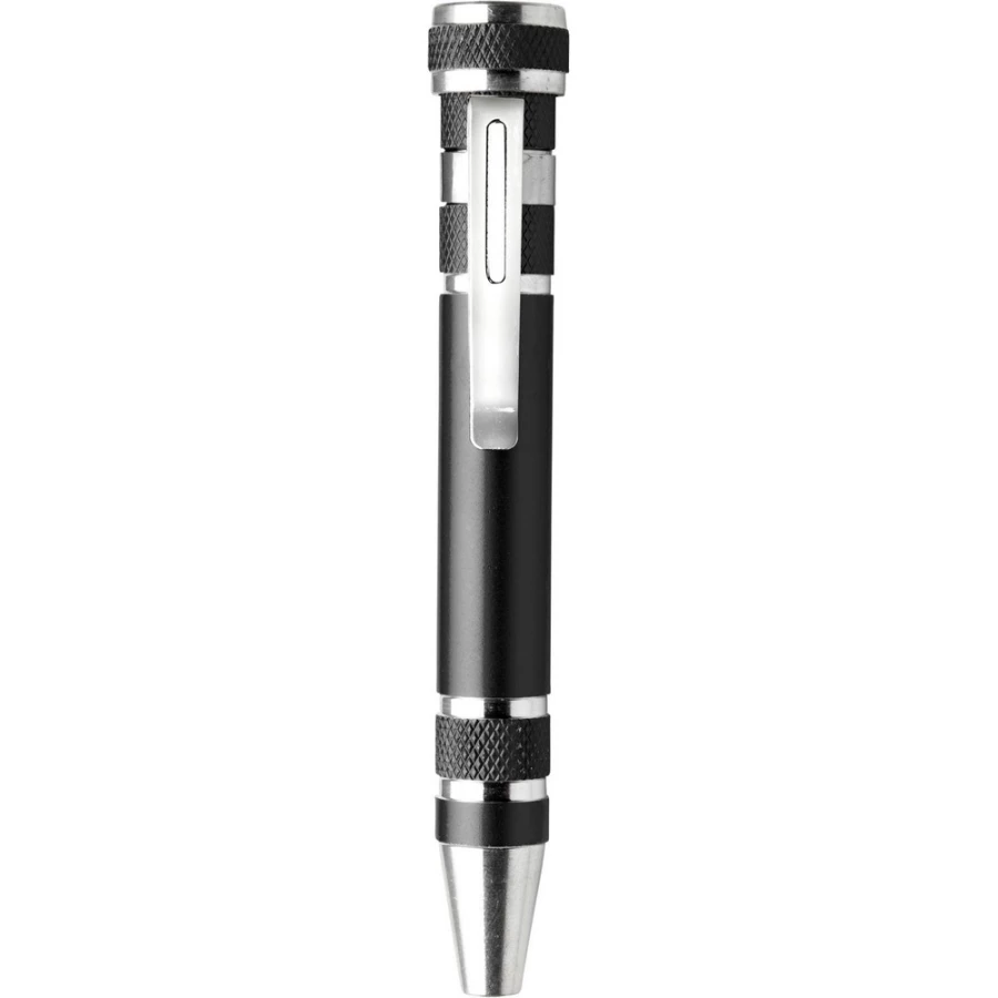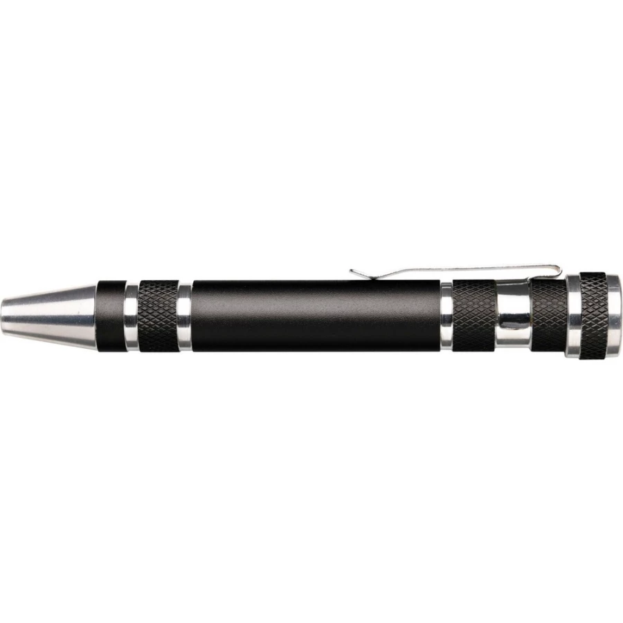 Pen-shaped screwdriver with 4 flat head and 4 cross screwdriver bits, with clip for attaching, product made from aluminium and steel