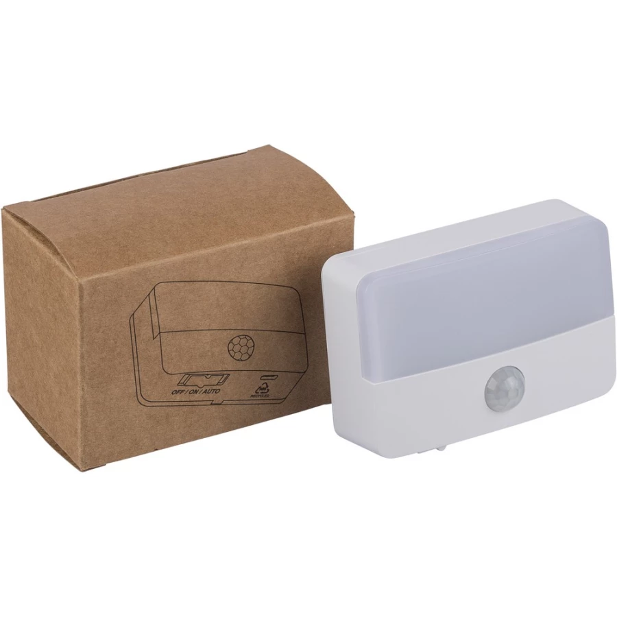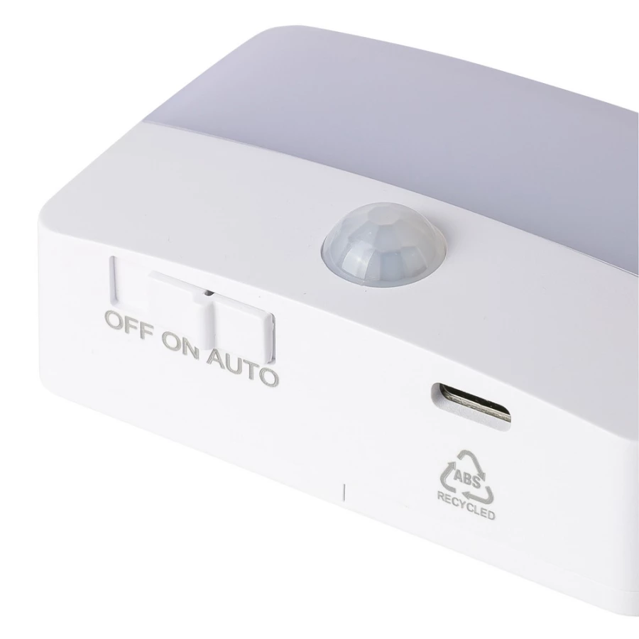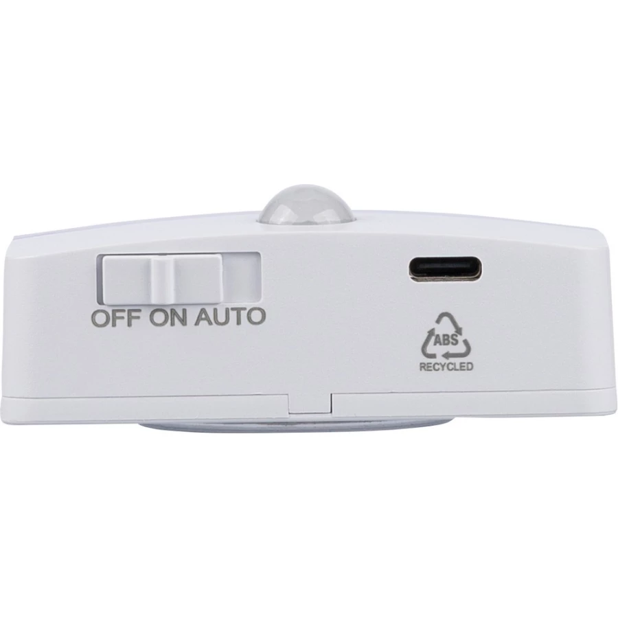 Sensor light 30 lm, rechargeable battery 500 mAh, magnet, adhesive tape on the backside, sensor length: 3-6m, angle: 120 degrees, includes ABS icon on the product bottom side, USB-C port, packed individually in brown carton box, product made from recycled ABS