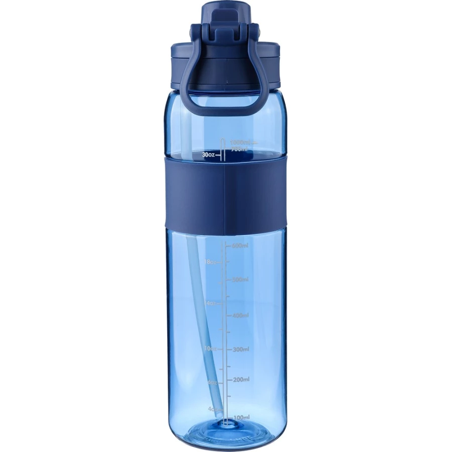 Tritan sports bottle, 900 ml, mouthpiece, screw-off lid, silicone ring, and handle for an easier carrying, capacity indicator on the side, packaged in eggcrate