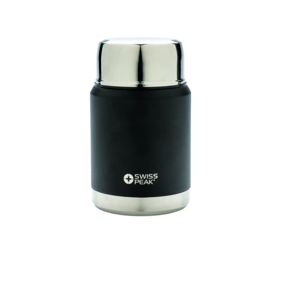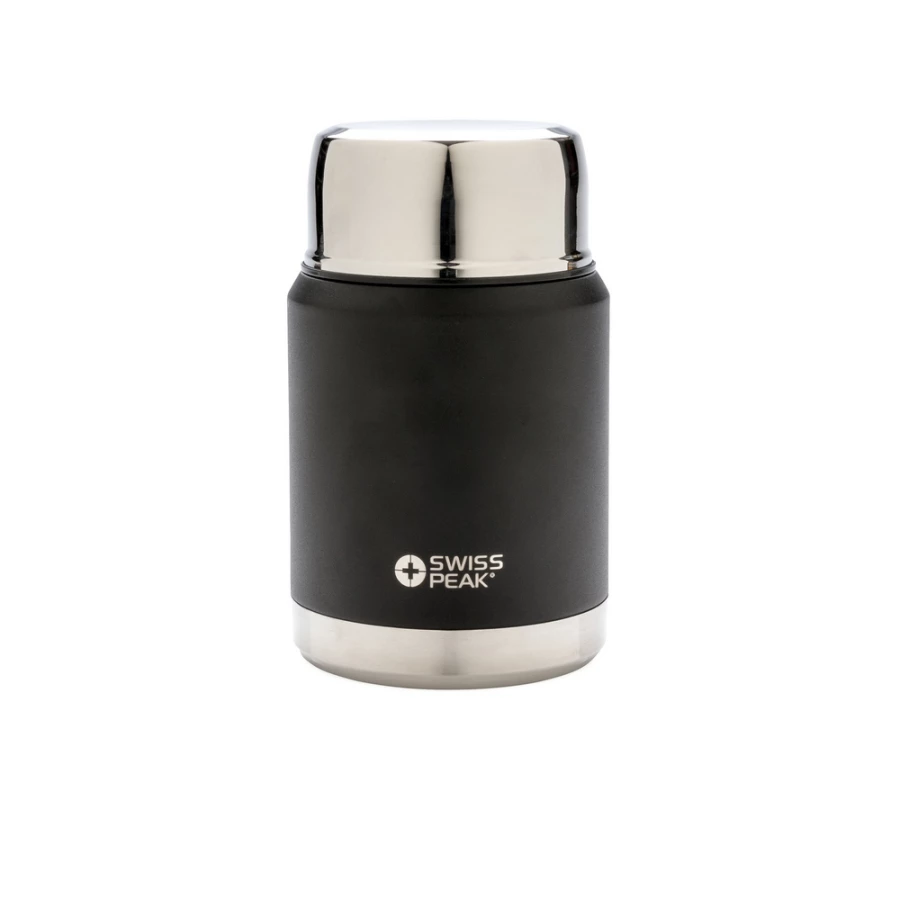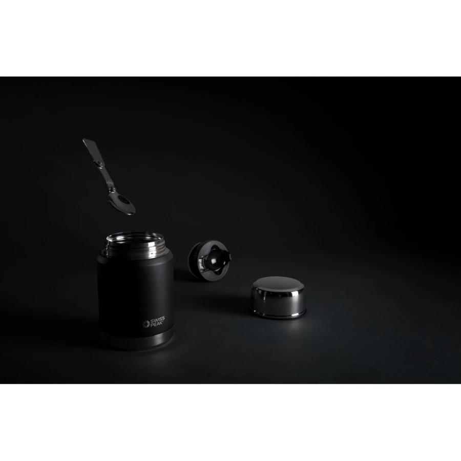 The Swiss Peak Elite series are with vacuum insulation and double wall 18/8 grade stainless steel. The powder coated black color is built to last! No fading or cracking here! The inner wall is plated with copper for ultimate conductivity to keep drinks hot for 8 hours and cold for 24 hours. This food container keeps your food hot or cold all day long! A 18/8 SS spoon is included. Hand wash only. Leakproof. Content 500 ml. ...