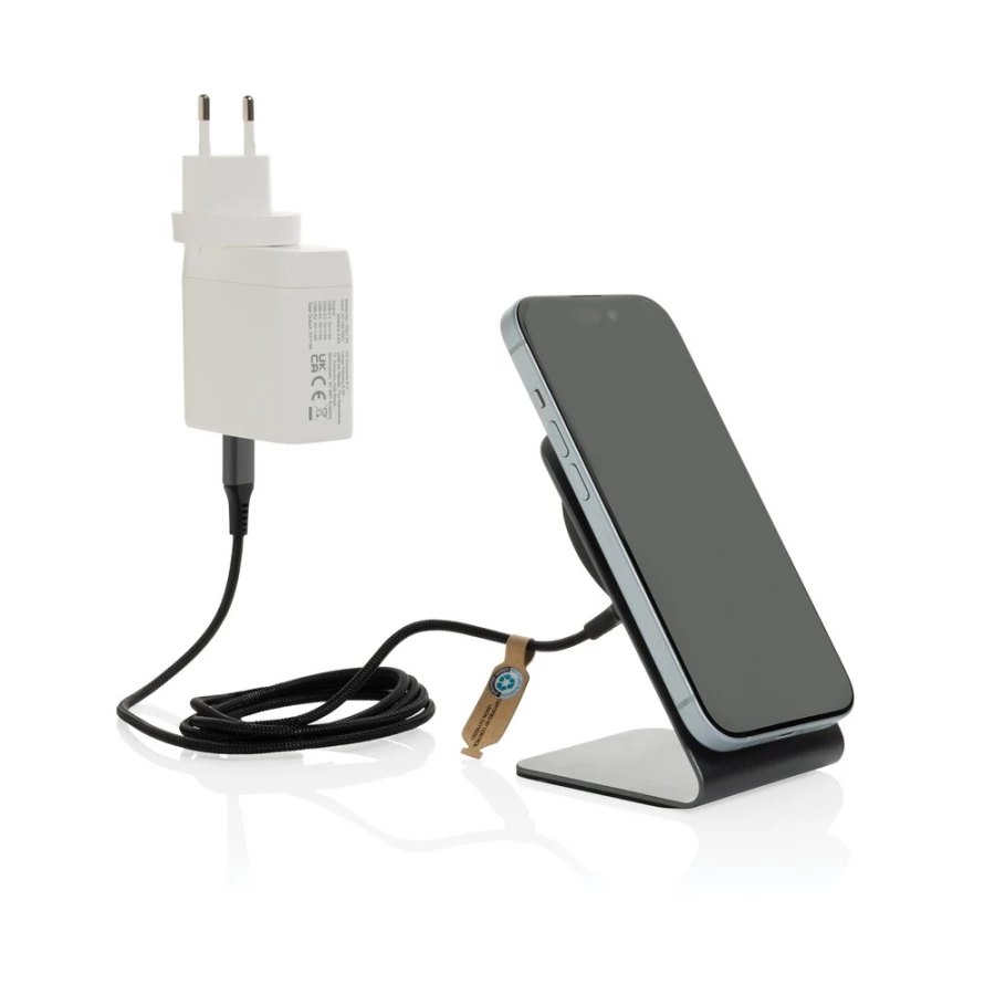 The Terra Aluminium 15W magnetic wireless charging phone stand redefines sophistication and performance. Delivering a powerful 15W output, its advanced magnetic system provides a secure hold for your device. With 15 precision magnets, it ensures flawless alignment for efficient charging, whether horizontal or vertical. The silicone base pads enhance stability, while the built-in charging indicator adds understated elegance. Made from RCS-certified recycled aluminum and ABS, the Terra stand combines refined design with a low i ...