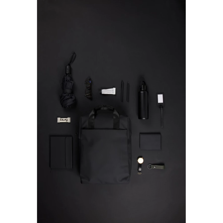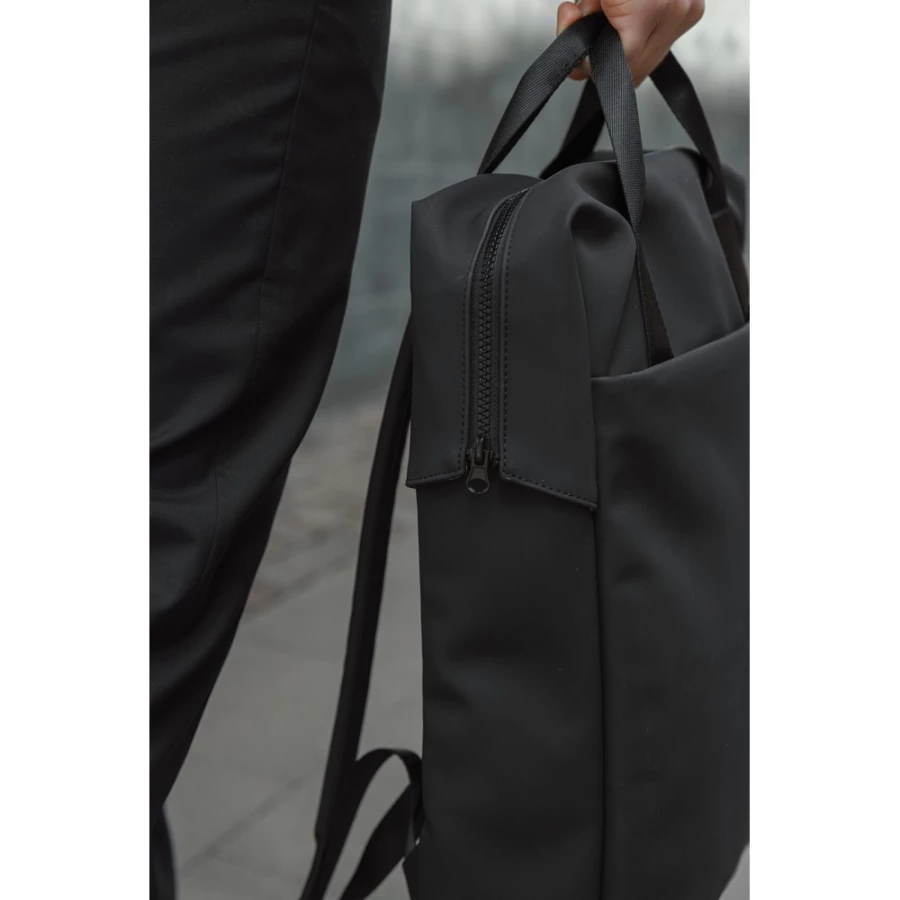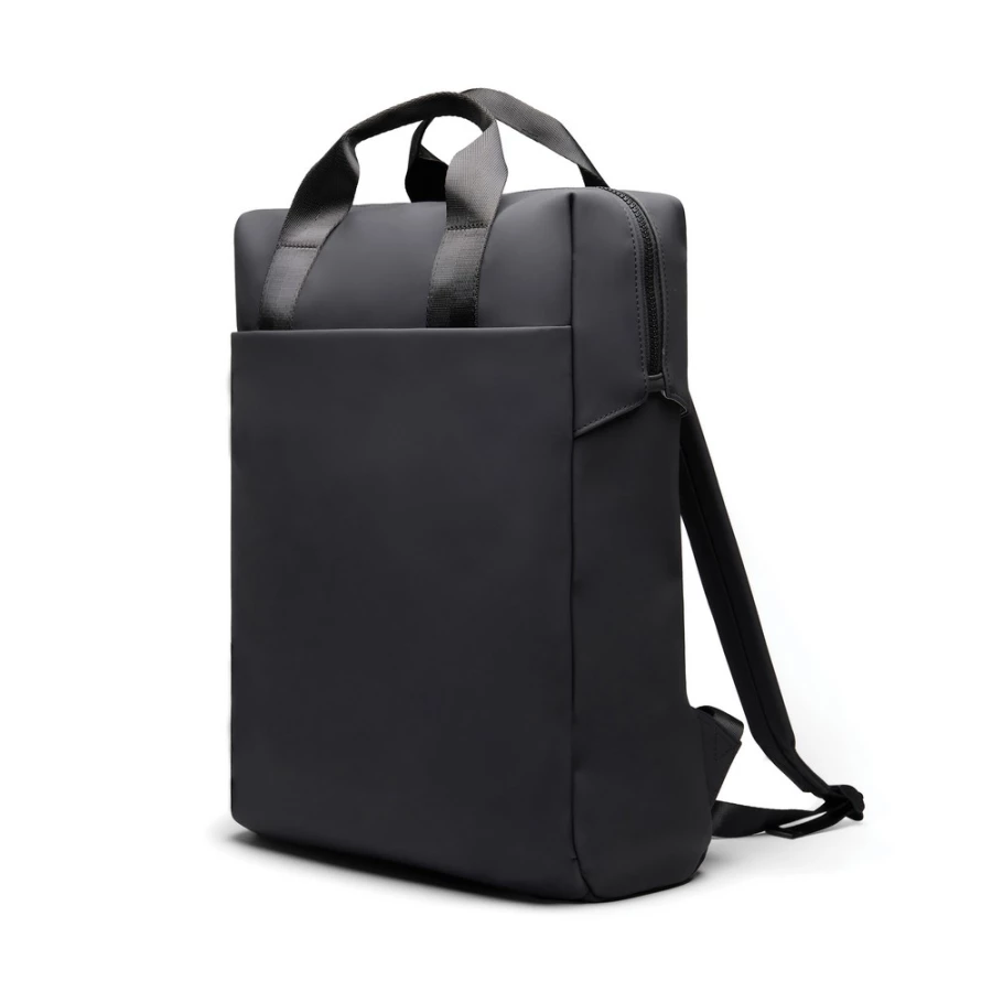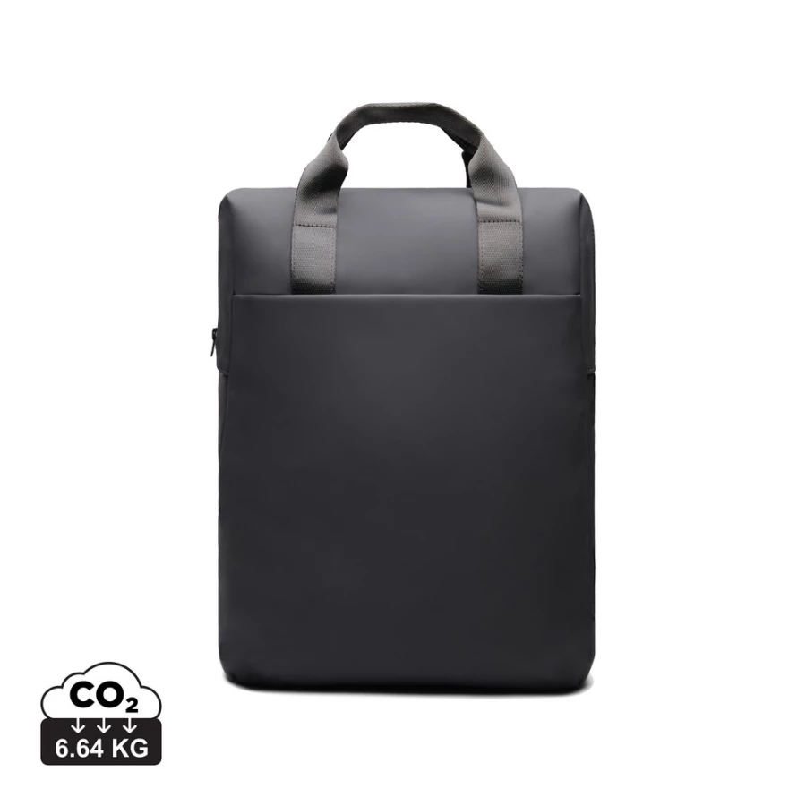 An easy-to-handle bag with a sleek design. Carry it as a tote bag or a backpack. The bag features a wide zippered opening for convenient packing of your laptop and other valuables. A strap on the back allows it to be attached to a trolley for smooth travel. It also includes a large front pocket, an inner pocket, and a practical bottle holder. Certified by RCS (Recycled Claim Standard), RCS certification guarantees that the entire supply chain of recycled materials is certified. The total recycled content is based on the overa ...