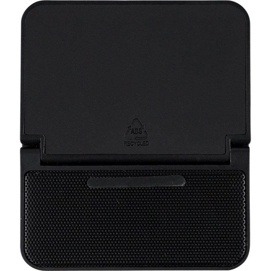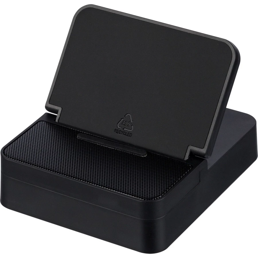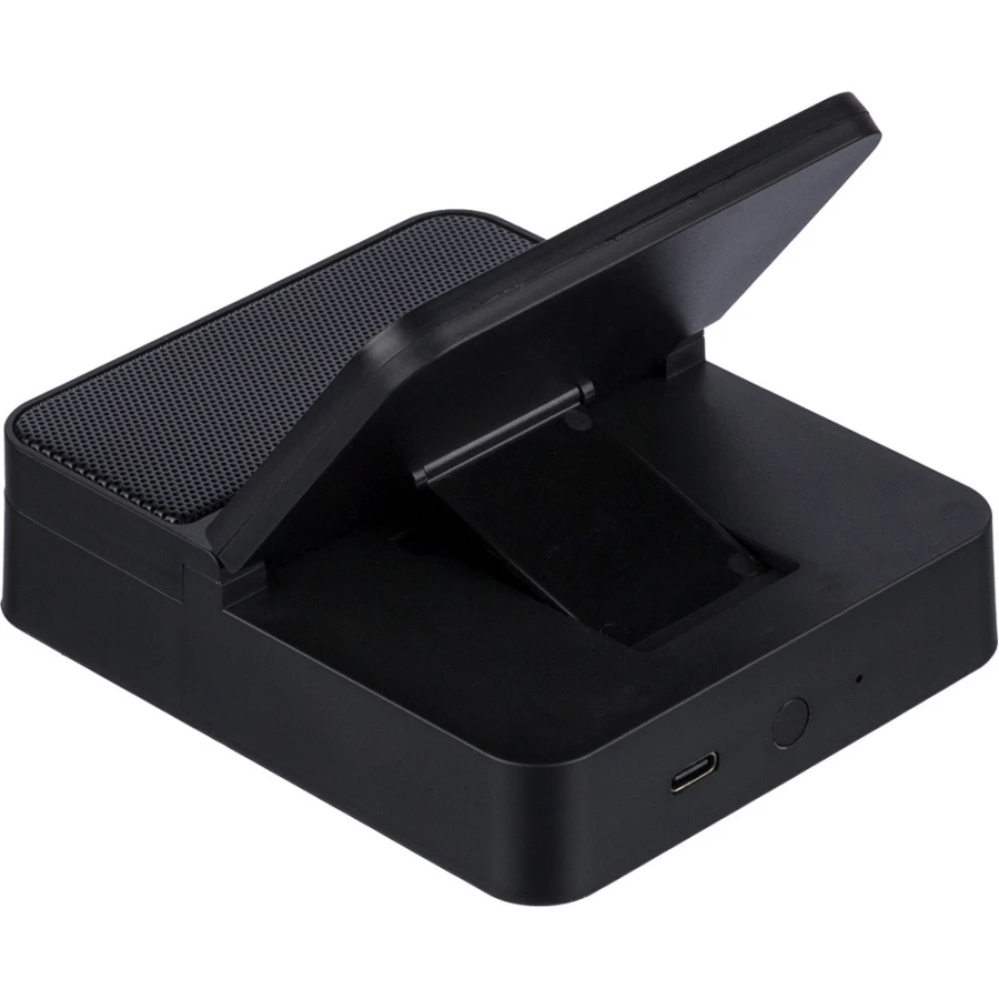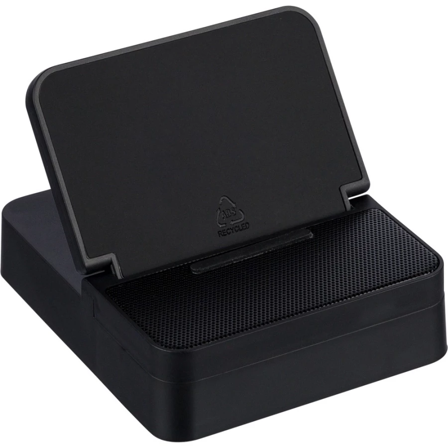Wireless charger 15W, phone holder, speaker 5W, battery 1200 mA, BT 5.4, input 5V/500mAh, metal mesh packed individually in brown carton box, product made from recycled ABS, metal and PU