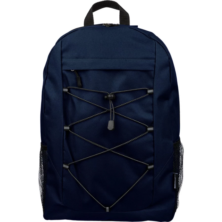 Plecak podróżny, siatkowate kieszenie po obu stronach, elastyczne sznurki z przodu do przymocowania butelki albo koca, zaciskane zamknięcie, mała kieszeń zapinana na zamek z przodu, kieszeń główna zapinana na zamek, ikona RPET na metce, produkt wykonany z RPET, poliestru i elastanu